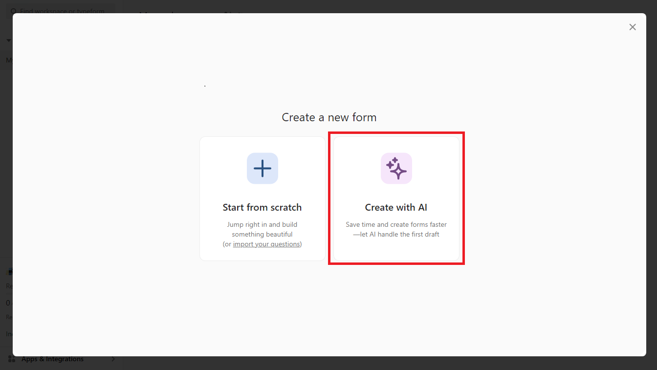 新しいフォームの作成にはカスタマイズ前提の「Start from scratch」と、AIがフォーム作成を支援してくれる「Create with AI」があります。