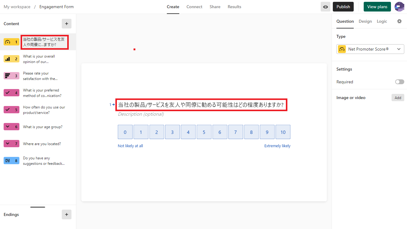 AIが作成した最初の質問は、製品やサービスの他者へのお勧め度で、回答形式は「Net Promoter Score」(11段階の段階評価)です。
