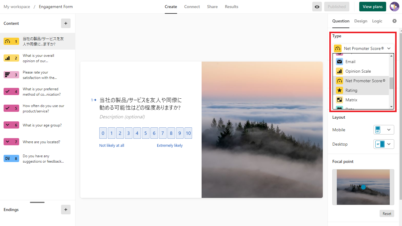 左の一覧には9個の質問事項が作成されています。画面右の設定欄にある「Type」を変更することで回答形式が変更できます。
