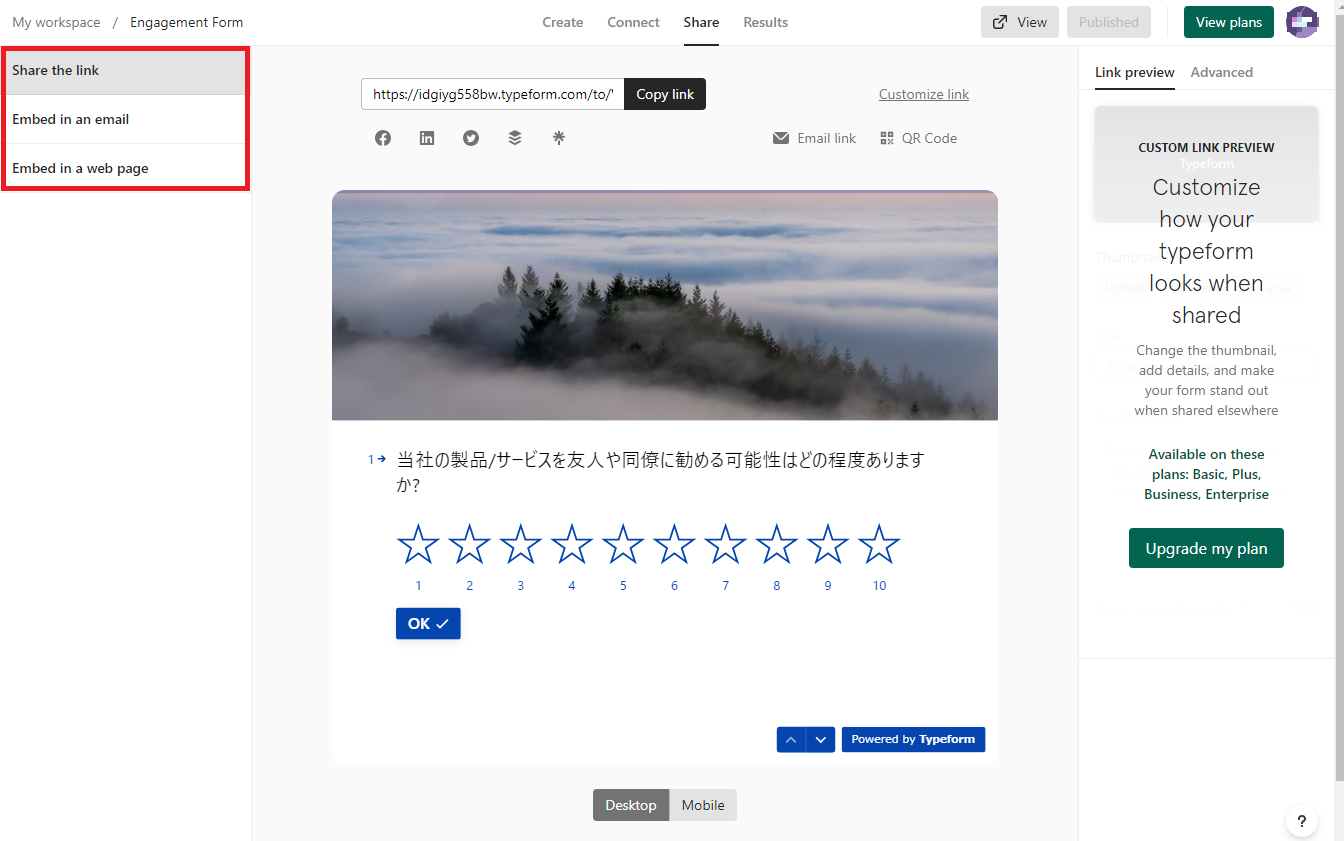 完成したフォームを公開するには、画面上部の「Share」(共有)のタブを押します。