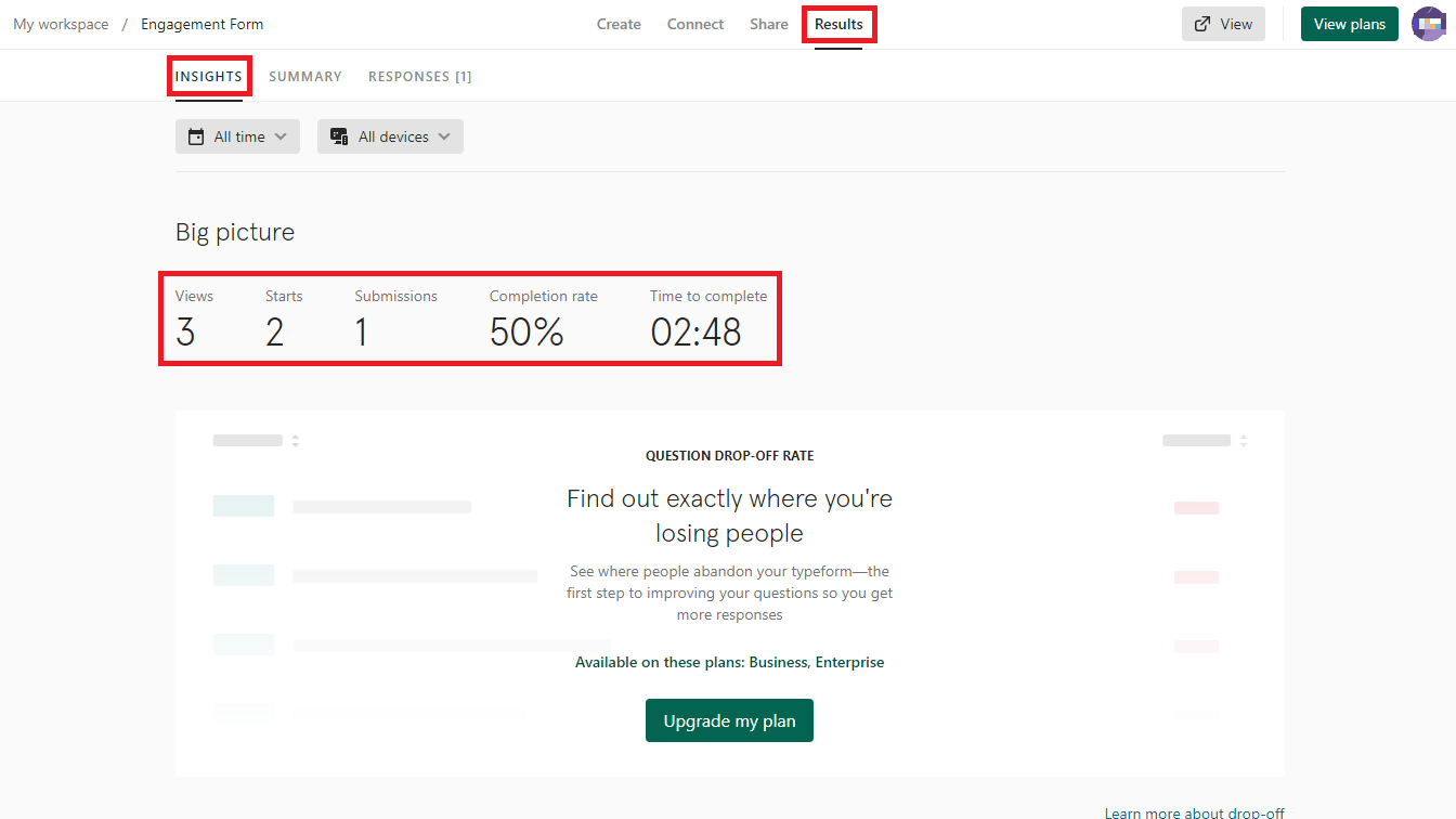 Typeformでは、フォームからの回答データを収集し、ダッシュボードでリアルタイムに確認できます。また、以下の方法でデータ分析が可能です。