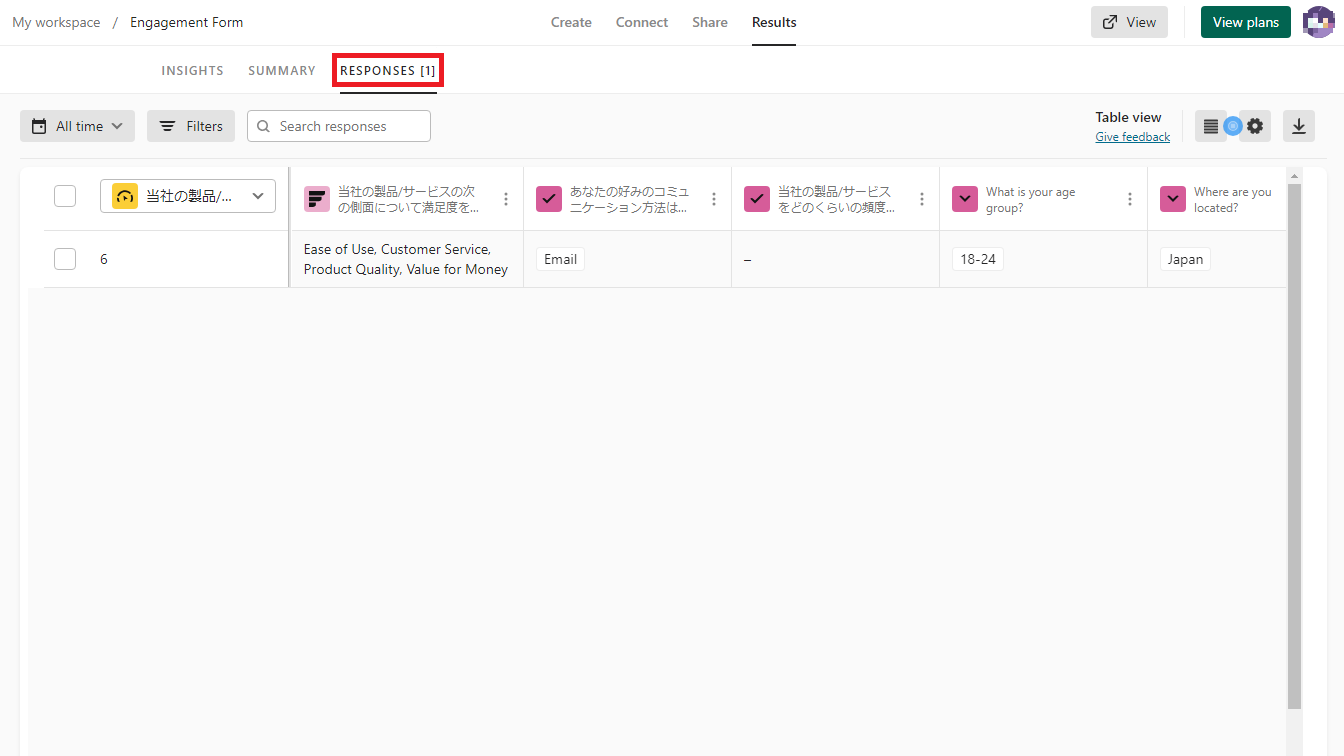 「RESPONSES」(反応)のタブを押すと、各回答者の結果が一覧として表示されます。