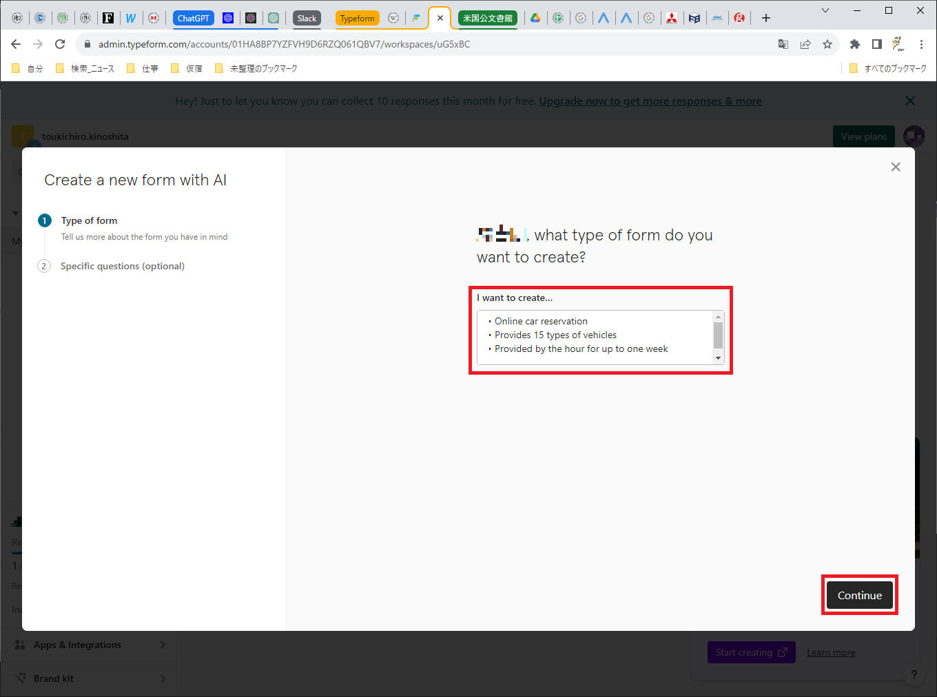 オンライン予約システムを作成します。「My workspace」で「Create a new form」を押して再び「Create with AI」でフォームを自動生成します。