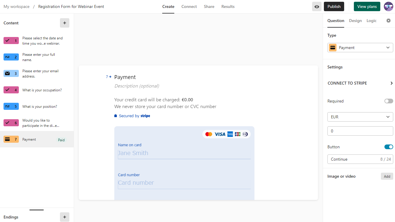続いてイベントの登録フォームを作成します。「My workspace」で「Create a new form」を押して再び「Create with AI」でフォームを自動生成します。