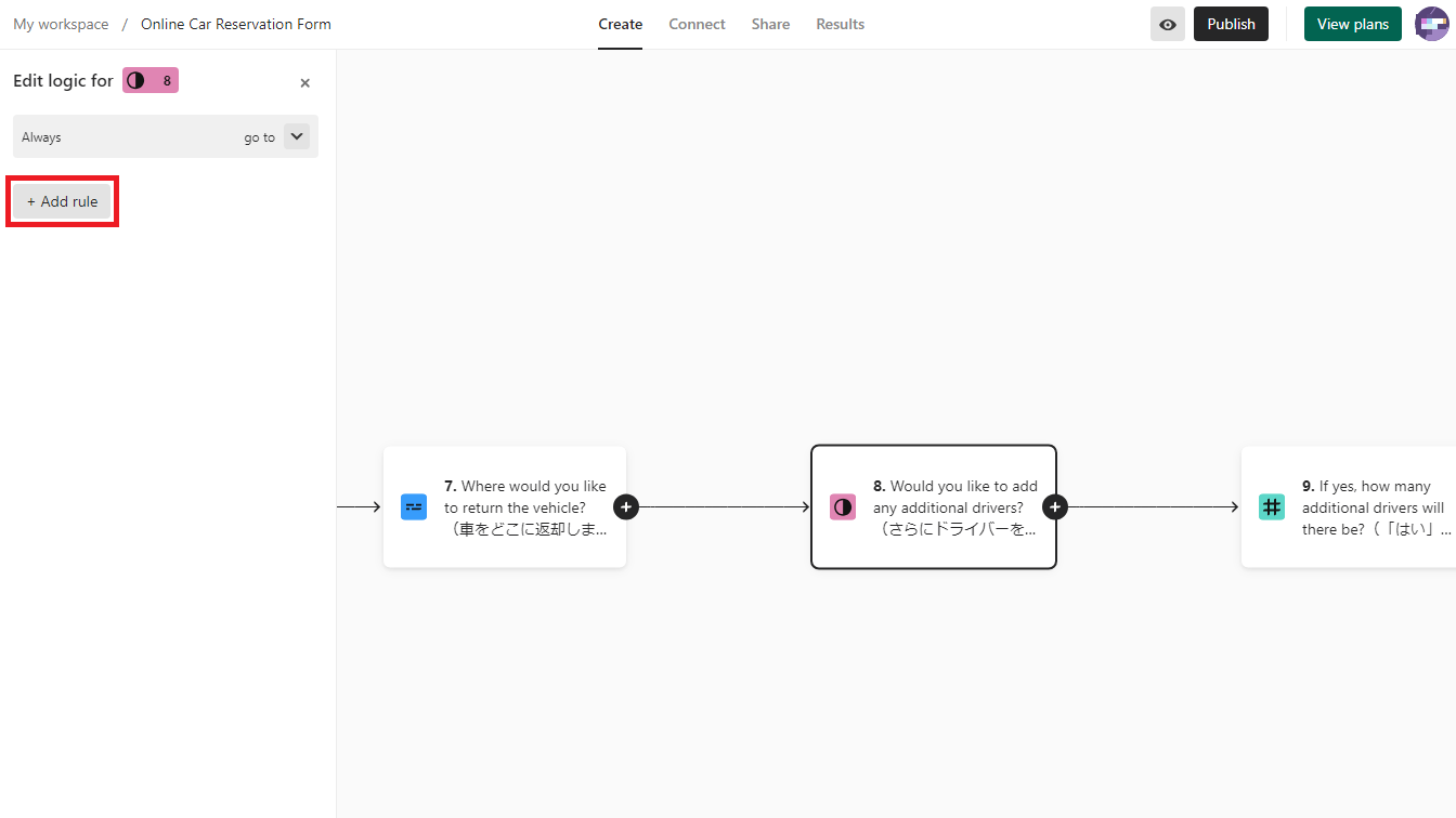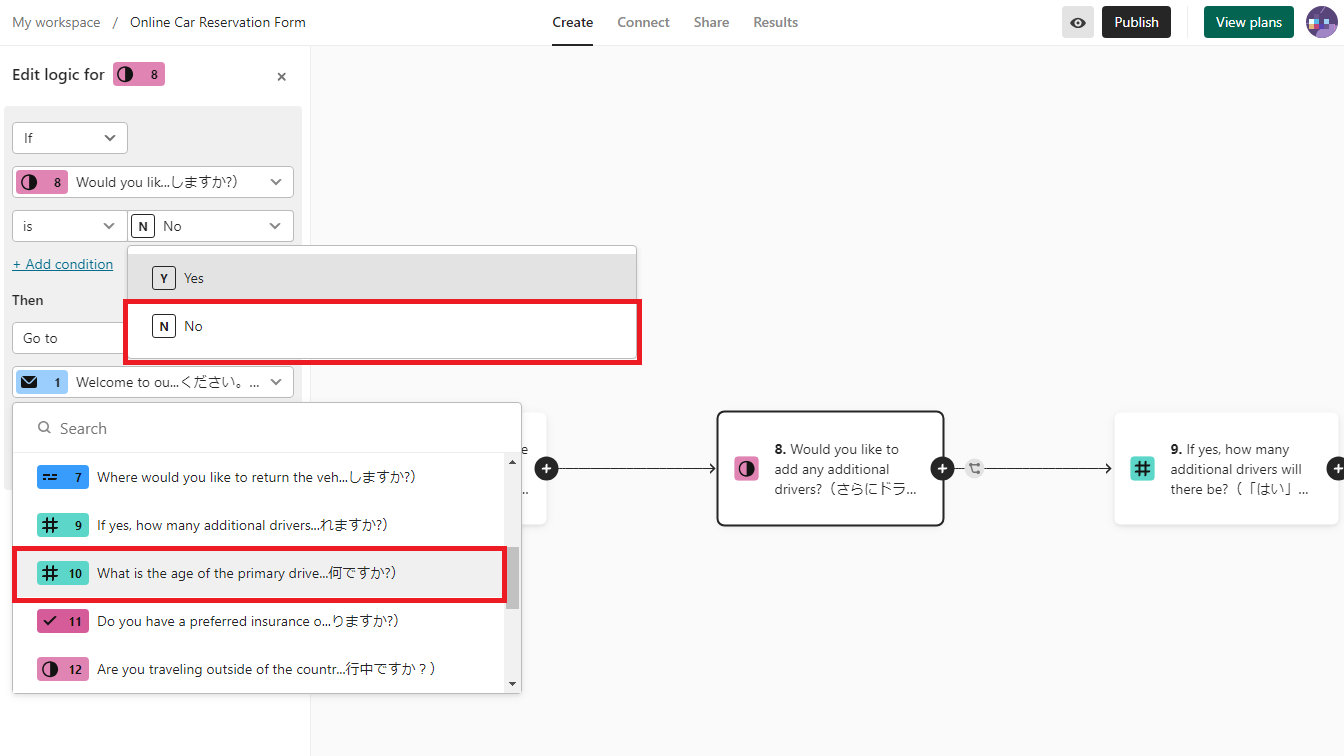 この8番のフォームはドライバーの追加を「Yes」「No」で選択し、9番で「Yes」の場合は人数を入力します。