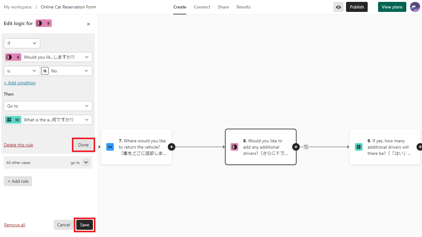 「No」であれば9番のフォームへの入力は不要となるため、スキップして10番のフォームにジャンプする設定をします。