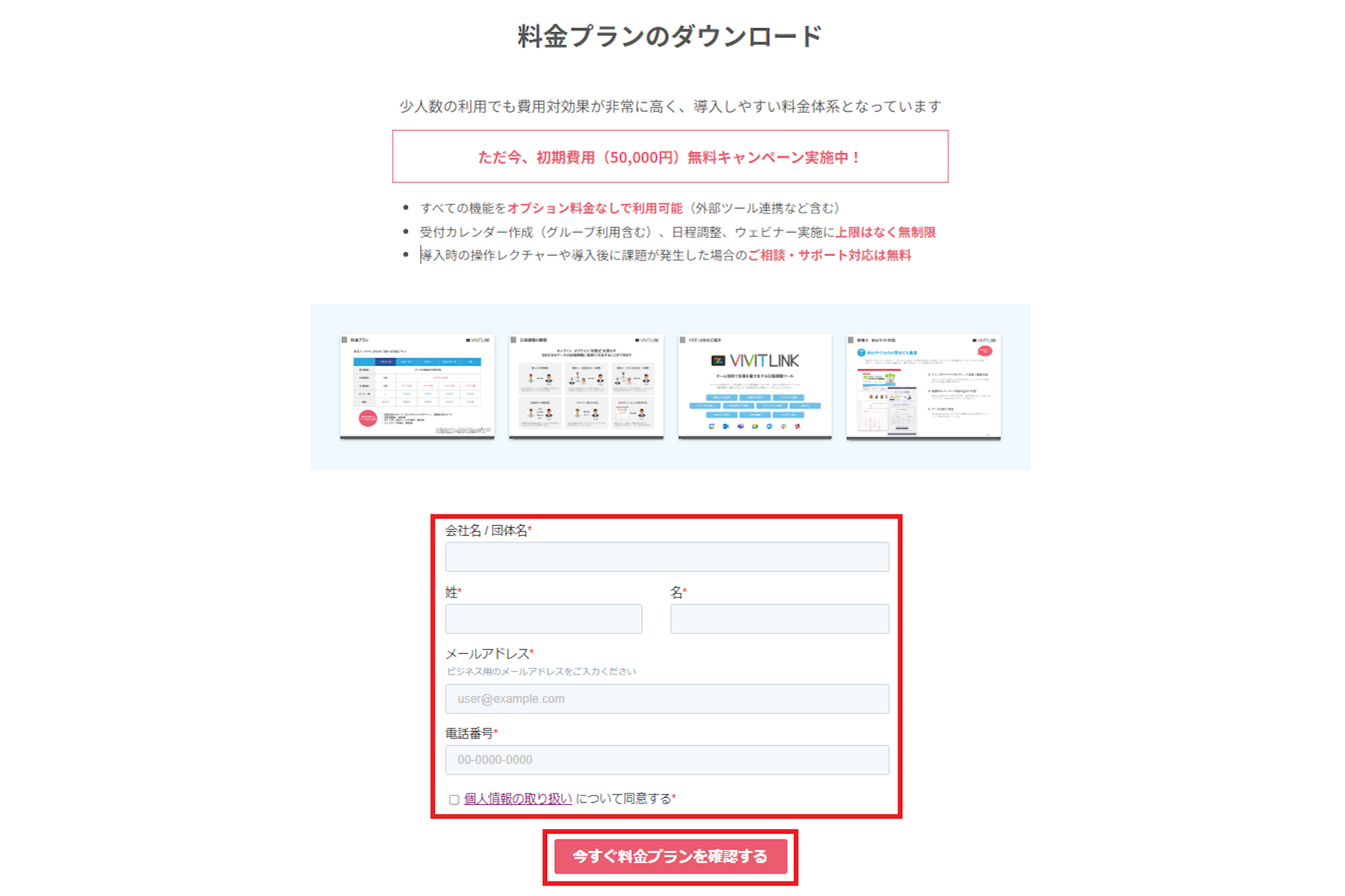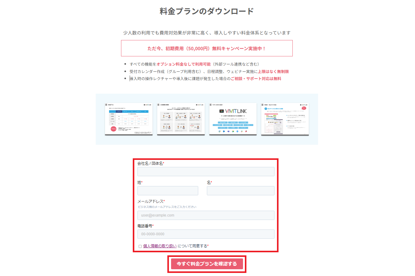 料金プランのダウンロードページで「会社名 / 団体名」「姓名」「メールアドレス」(ビジネス用のメールアドレス)「電話番号」を入力します。