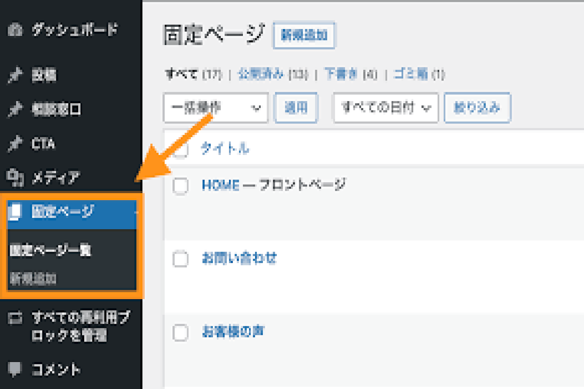 固定ページを作成するには、管理画面の左メニューから「ページ」→「新規追加」をクリックし、タイトルと本文を入力します。