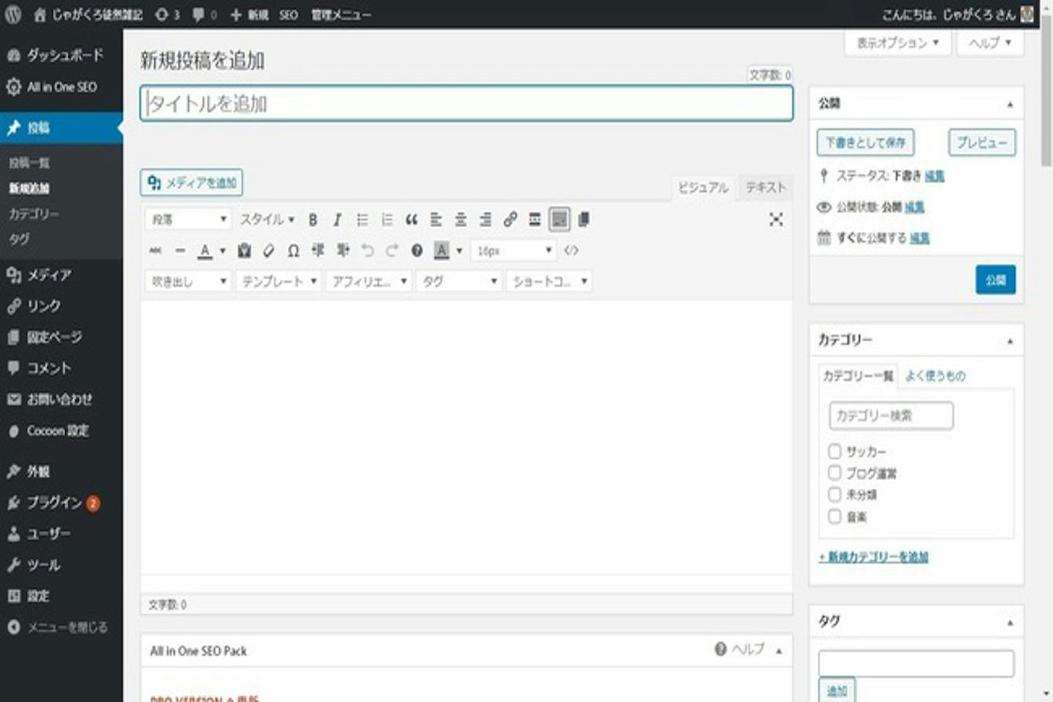 すると、記事を投稿するための画面が表示されます。タイトルを入力し、本文を書いていきましょう。