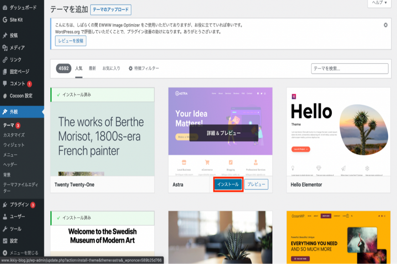 入力が完了したら「インストール」をクリックすれば、WordPressが自動的にインストールされます。