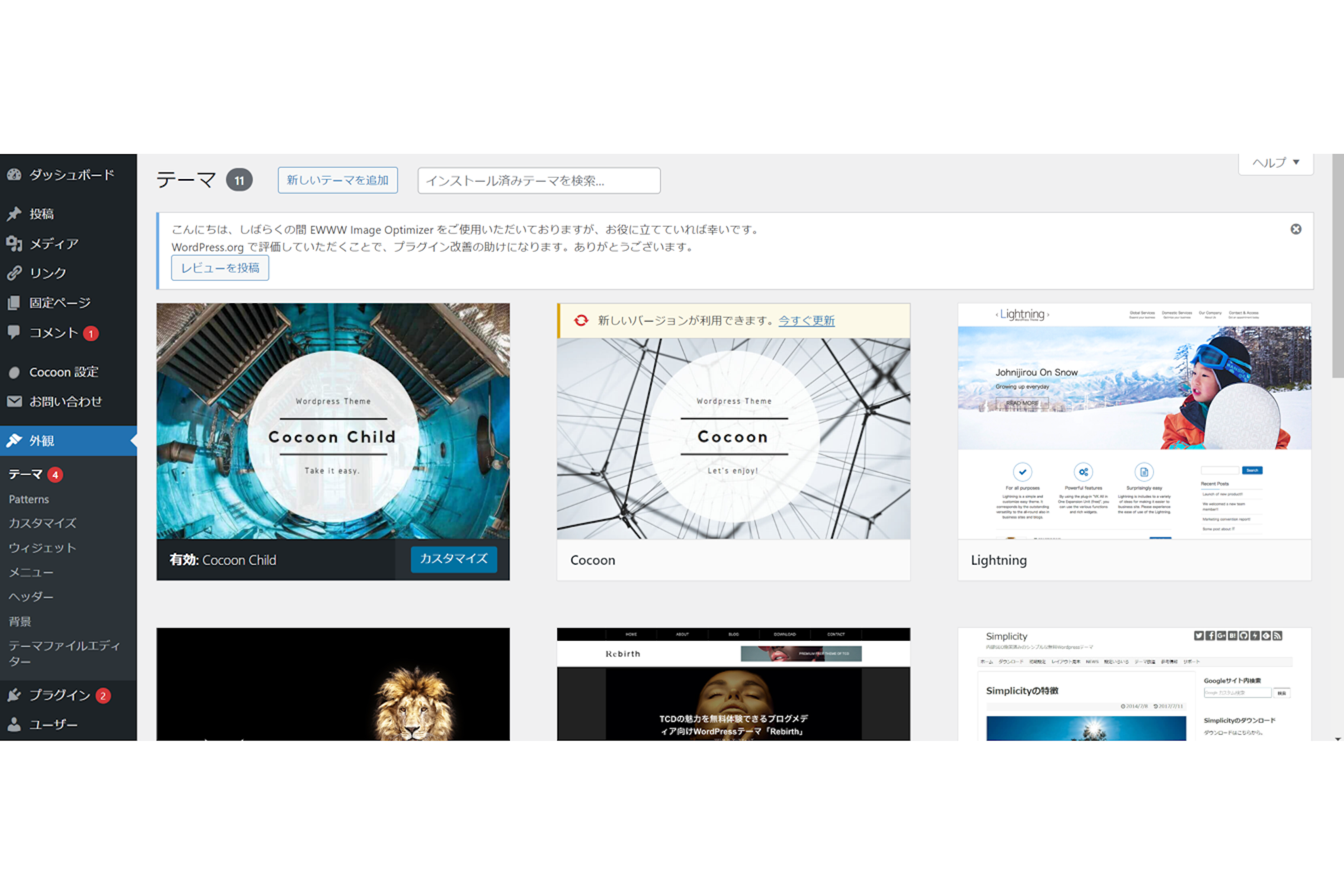 テーマは、管理画面の「外観」→「テーマ」から変更できます。