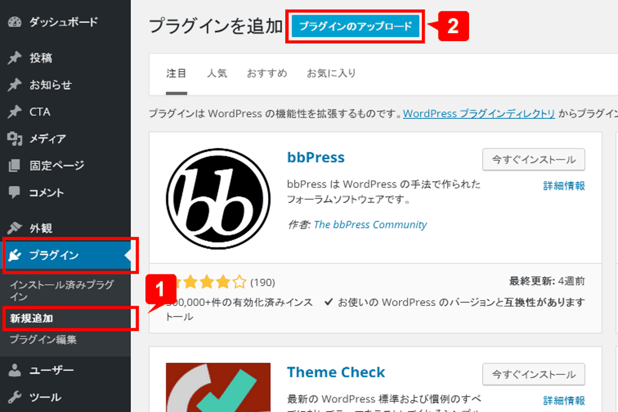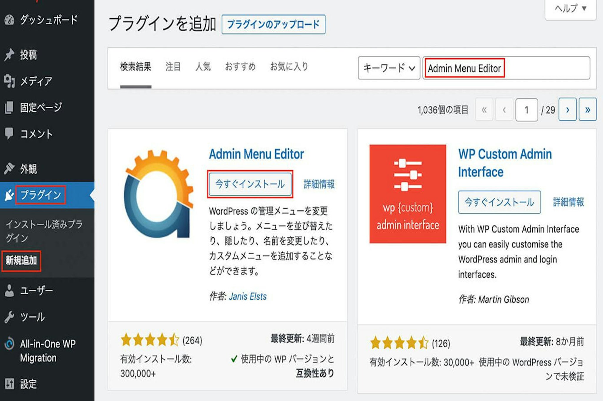 プラグインは、管理画面の「プラグイン」→「新規追加」からインストールできます。