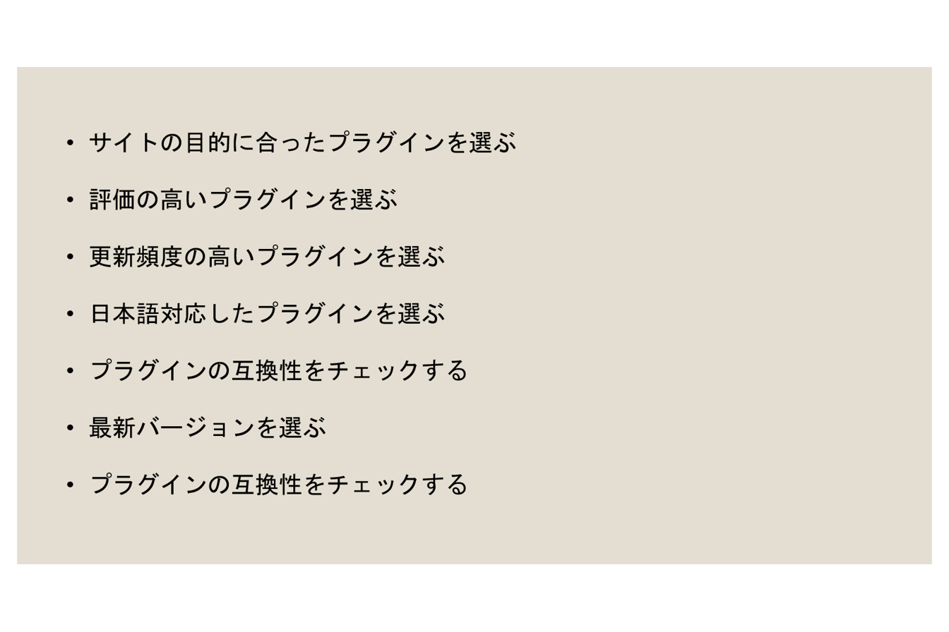 プラグインを選ぶ際は、いくつか注意すべきポイントがあります。