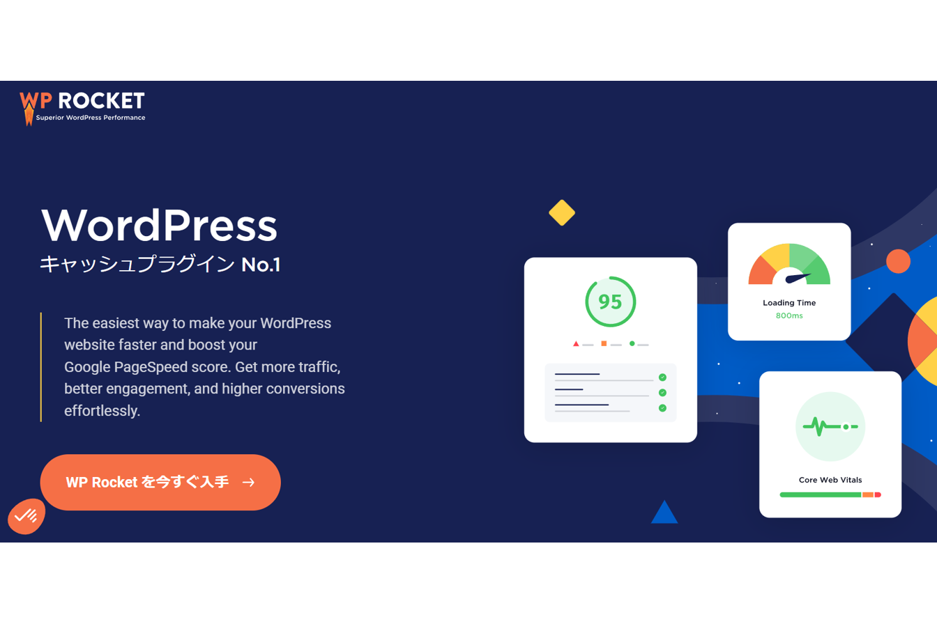 WP Rocketは、サイト高速化に定評のあるキャッシュプラグインです。ページキャッシュ、ブラウザキャッシュ、遅延読み込みなど、多彩な機能でサイトのパフォーマンスを改善できます。