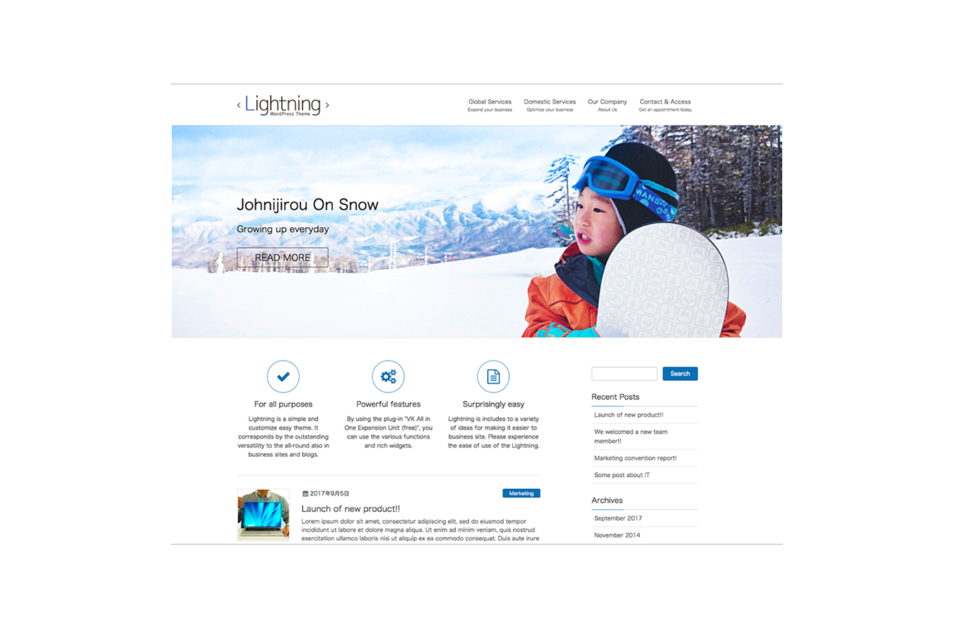 Lightningは、シンプルでカスタマイズのしやすさが売りのテーマ。初めてWordPressを使う方でも直感的に操作でき、思い通りのサイトを作れると好評です。