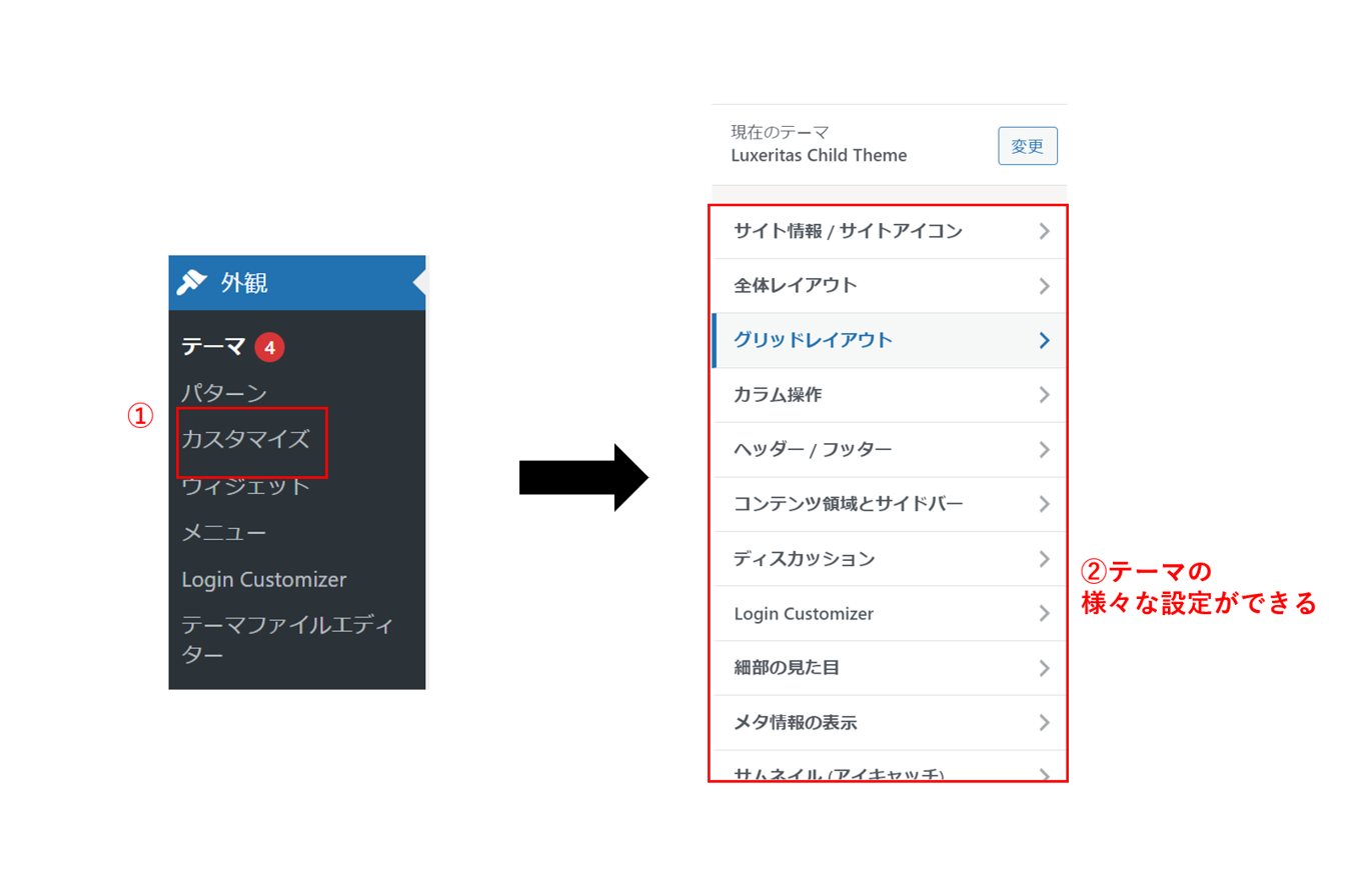 まず、管理画面の「外観」から「カスタマイズ」を選択します。すると、カスタマイズ画面が表示されます。ここで、サイトタイトルやタグライン、カラースキーム、背景画像などを設定できます。