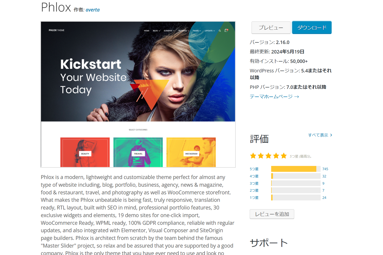 Phloxは、カスタマイズ性の高さが売りのマルチパーパステンプレートです。豊富なデザインオプションを備えているため、初心者でも思い通りのサイトを作れます。
