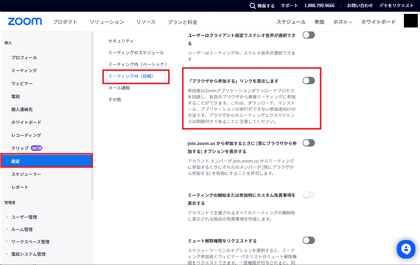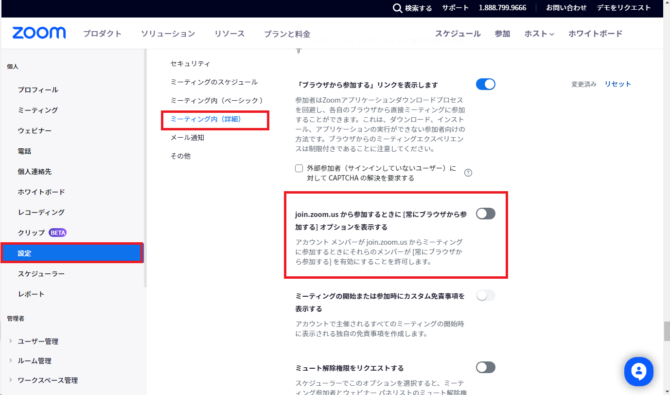 上記の設定項目は、アカウント管理者がZoomのビデオ通話を開始し、招待を送った場合に有効となるオプションですが、アカウントメンバーが招待リンクからビデオ通話に参加するときに常にブラウザから参加するためのオプションを表示させる設定があります。