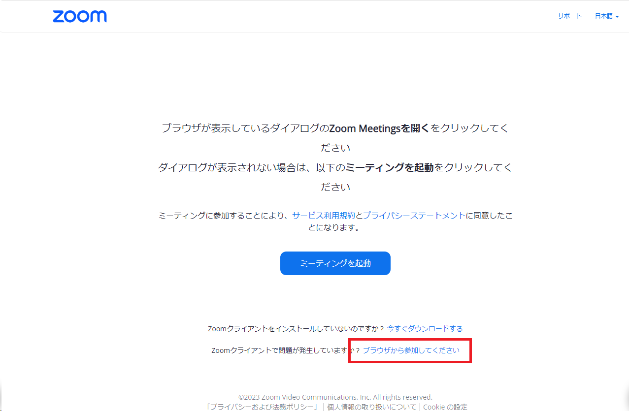 参加者は、ブラウザからビデオ通話に参加したいという場合には、ビデオ通話に参加する招待URLを開いたときに表示される上の画面で、「ミーティングを起動」のボタンではなく、下にある「ブラウザから参加してください」のリンクをクリックすることで、ブラウザからビデオ通話に参加することができます。