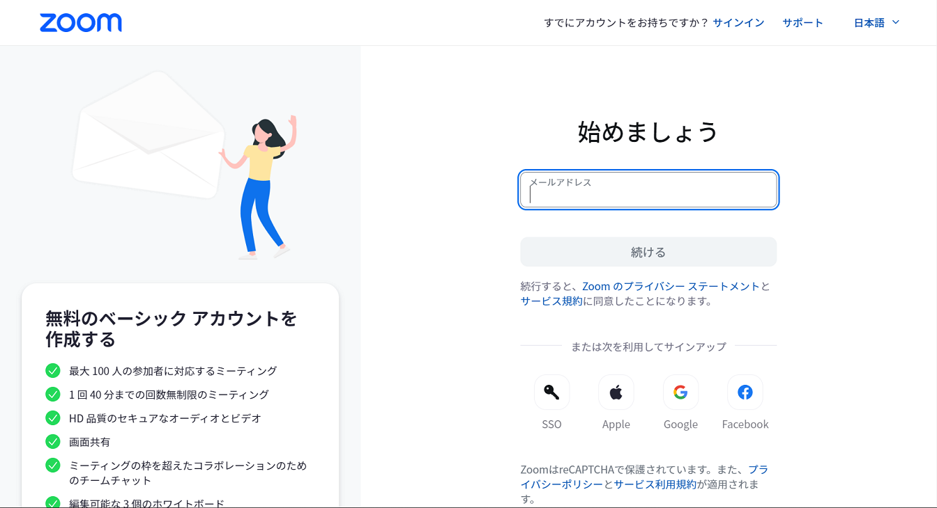 ZoomのWebサイトにアクセス。メールアドレスを入力して「サインアップは無料です」をクリックします。