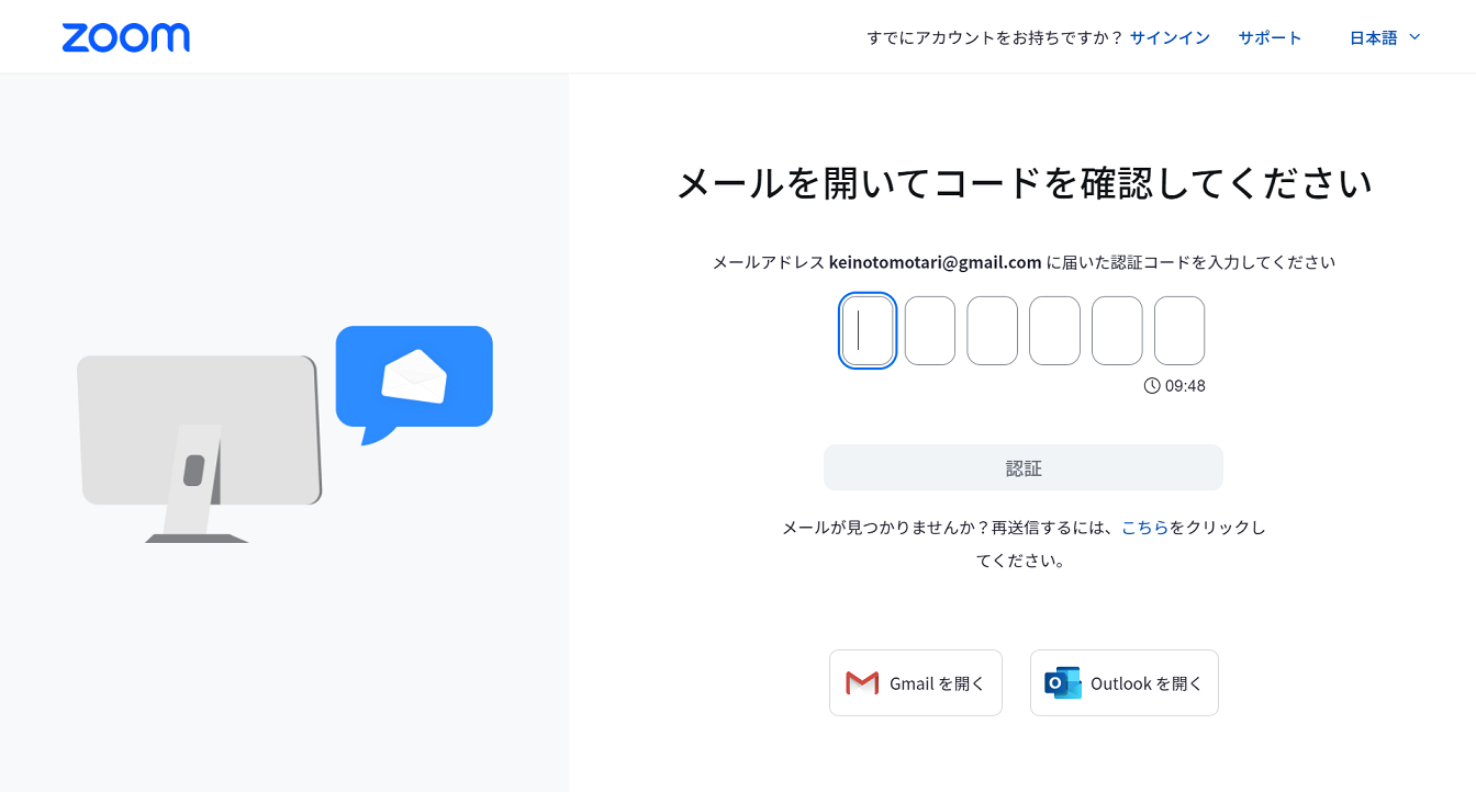 届いたメールに設定されているコードを入力します。