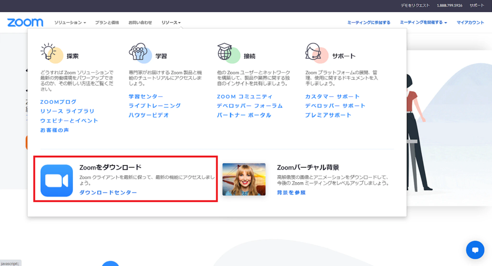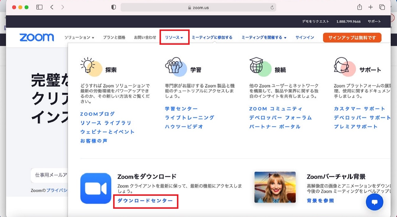 トップのバナーに「リソース」という項目があるのでクリックすると、下の方に「Zoomをダウンロード」という文字が見えます。