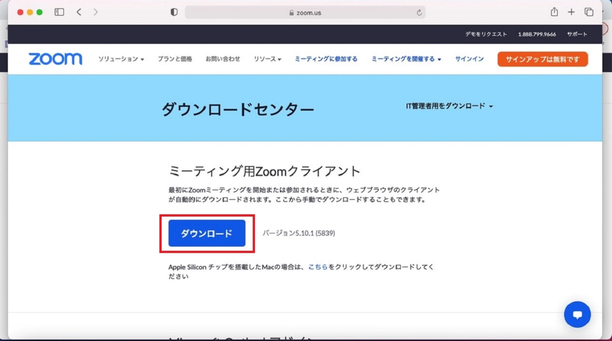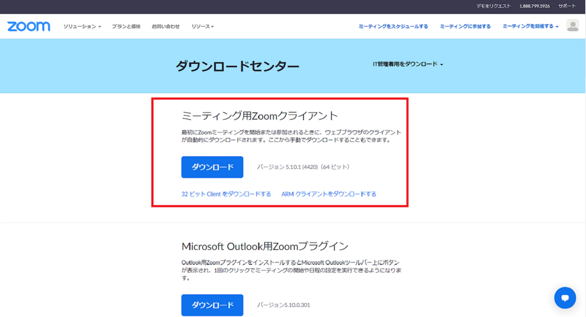 パソコン用のアプリがほしい場合、赤枠で囲んだ「ミーティング用Zoomクライアント」をダウンロードします。
