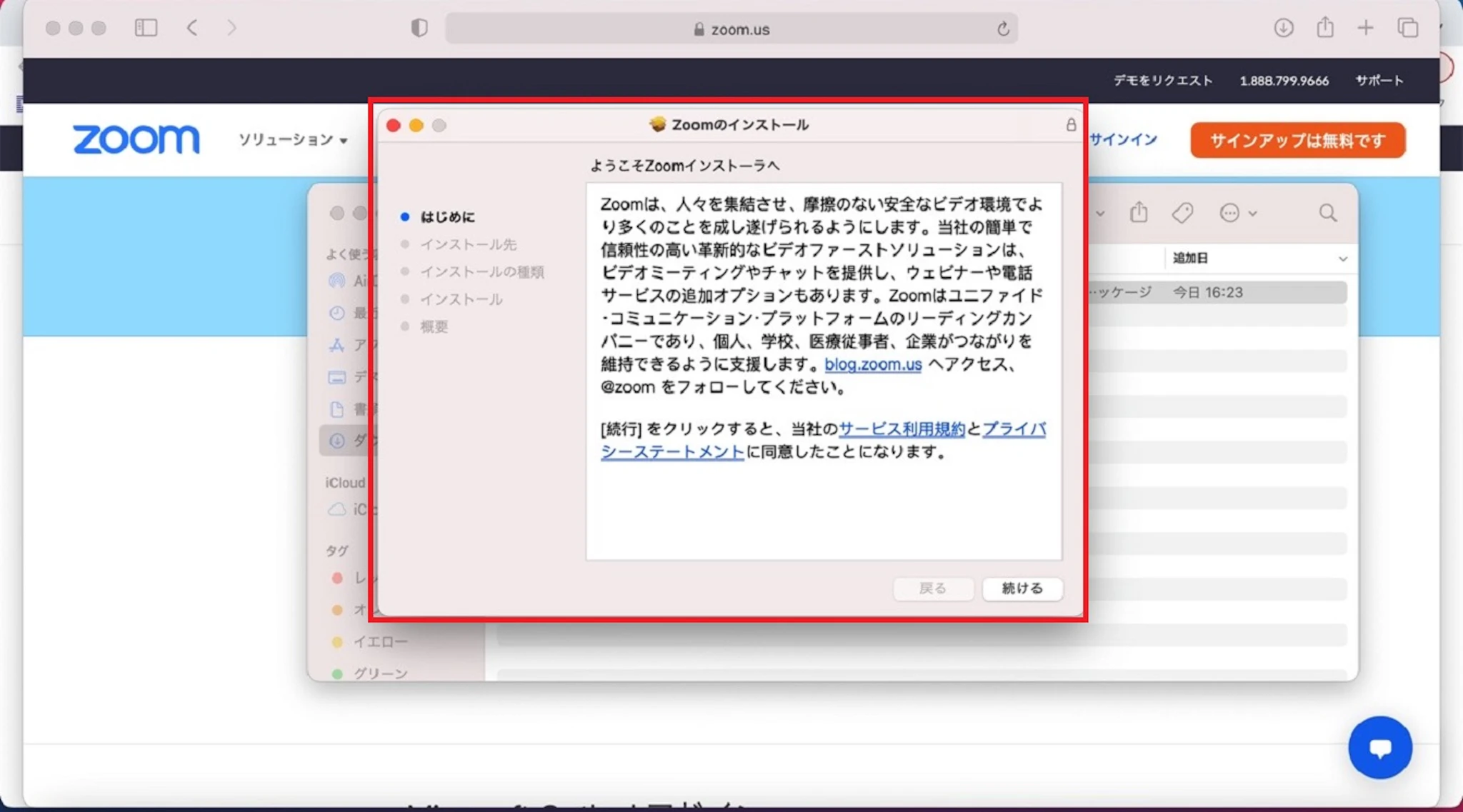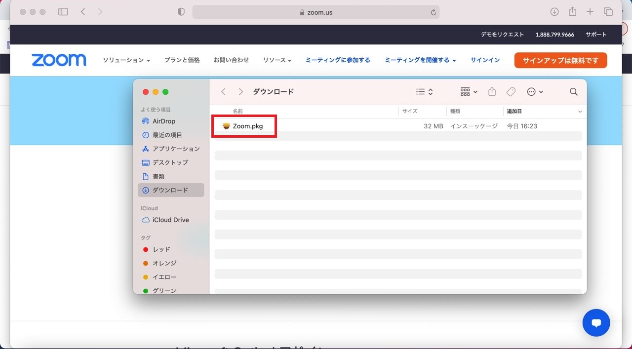 ダウンロードフォルダを見ると、Zoom.pkgというファイルがあるので、クリックします。