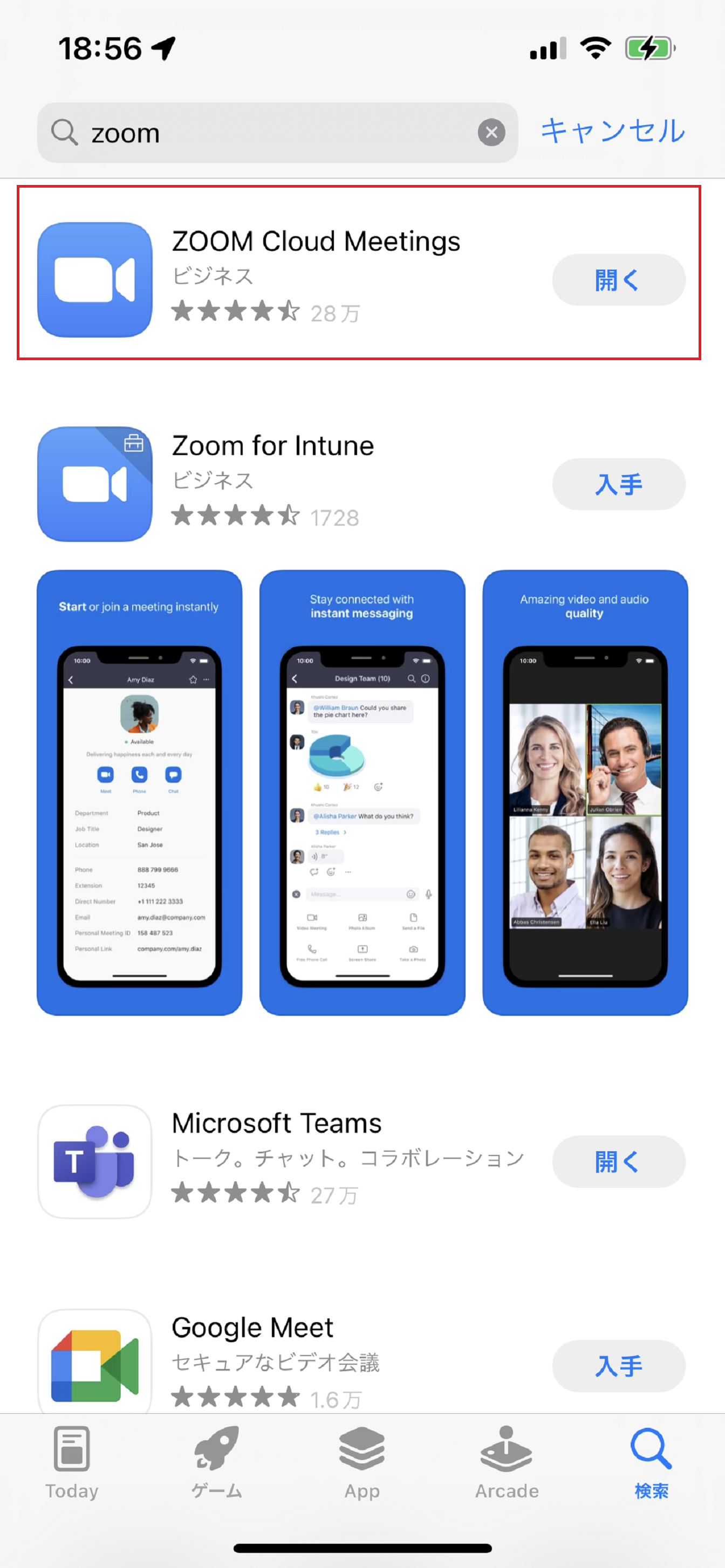 すると、Zoom Cloud Meetingsというアプリがでてきますので、タップしてダウンロードすれば完了です。