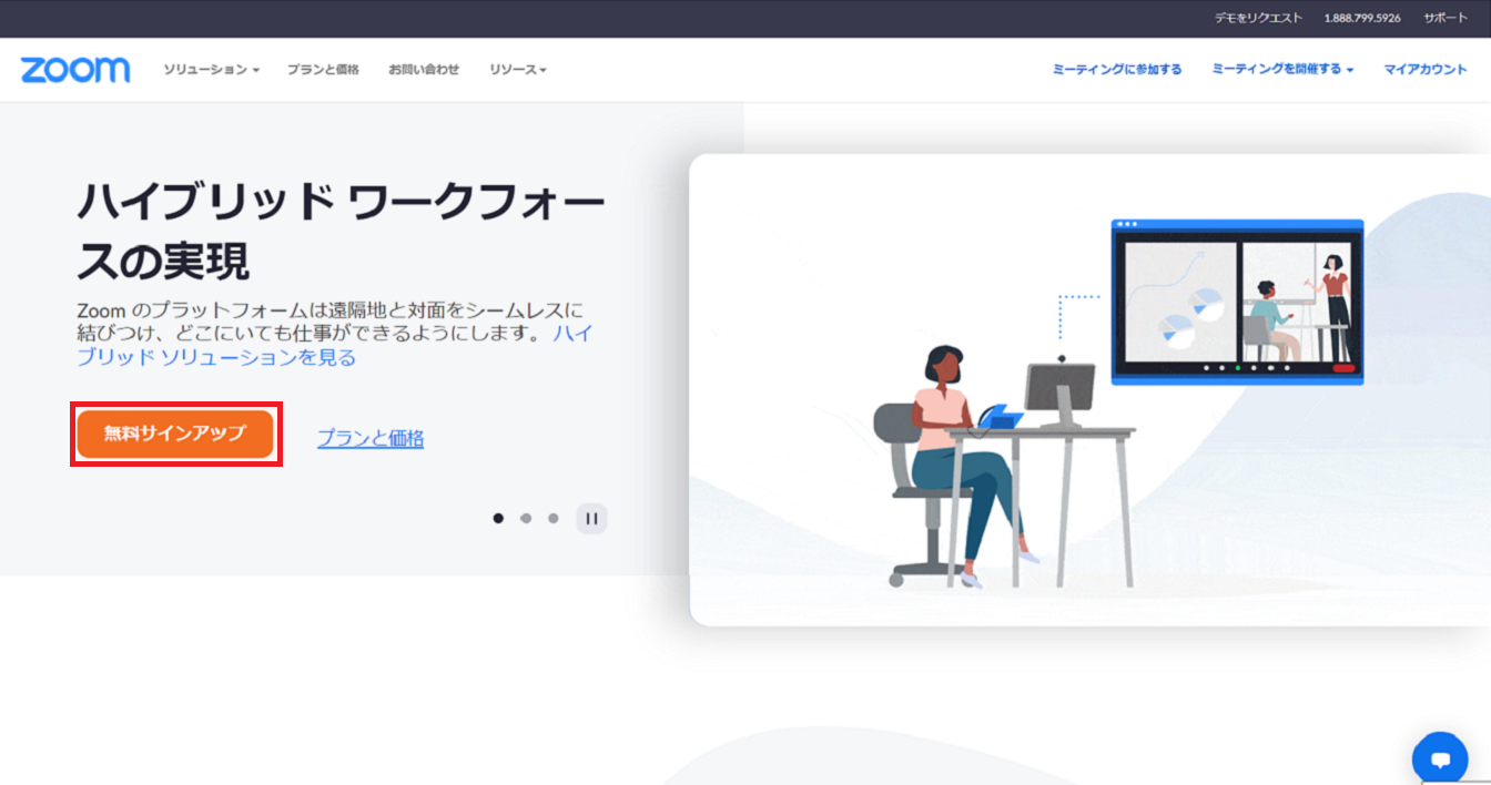 まずは、Zoomのウェブサイト(https://zoom.us/)にアクセスしてみてください。