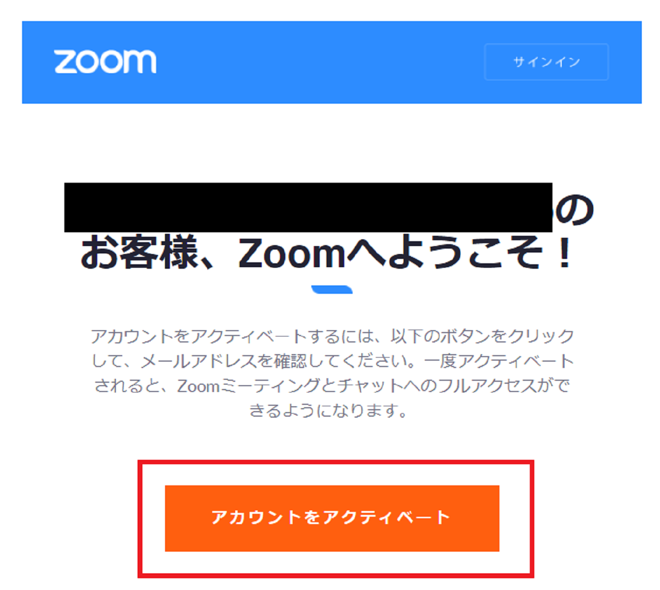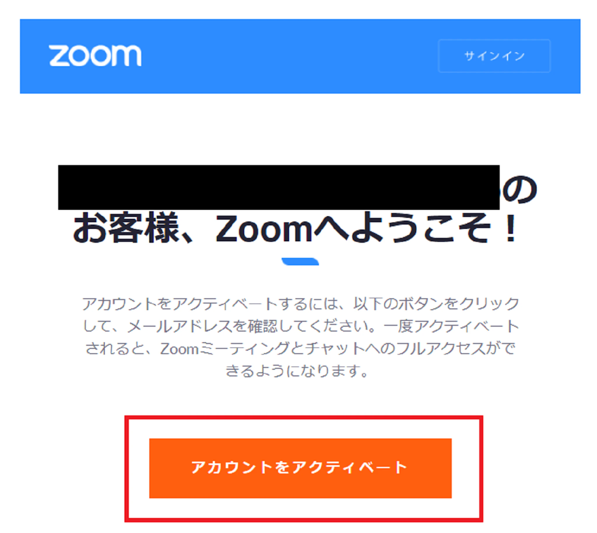 メールアドレスを入力すると、「Zoomアカウントをアクティベートしてください」という件名のメールが届きます。