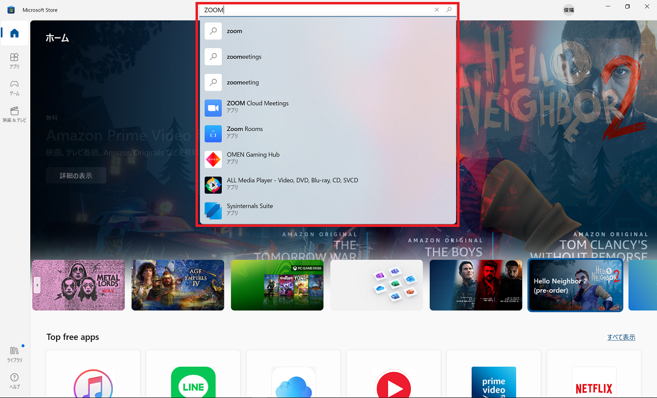 検索窓にZoomと入力すると、「Zoom Cloud Meetings」というアプリがでてくるので、クリックしましょう。