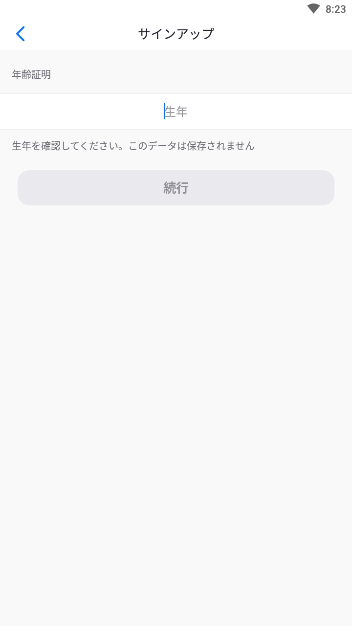 「年齢証明」という画面に移行するため、ここで「生年」を入力し、「続行」をタップします。
