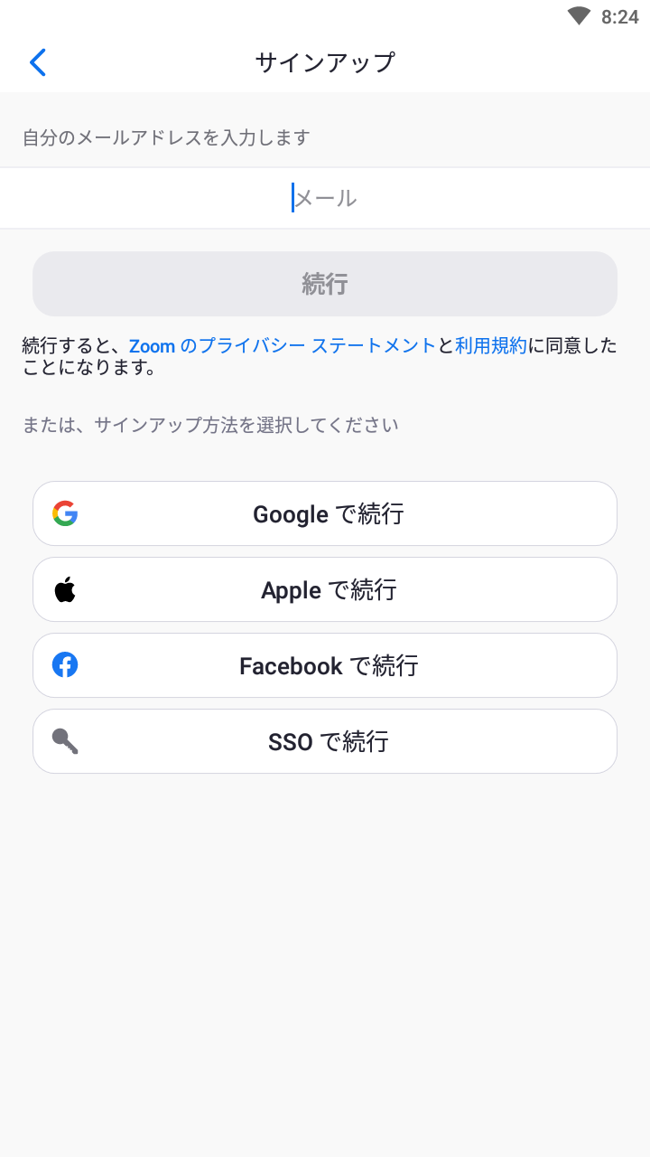 「サインアップ」という画面が表示されるため、ここでメールアドレスを入力し、「続行」をタップします。