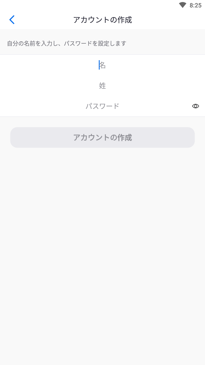 名・姓・パスワードを入力し、「アカウントの作成」をタップします。これで、モバイルデバイスからのアカウント作成は完了です。