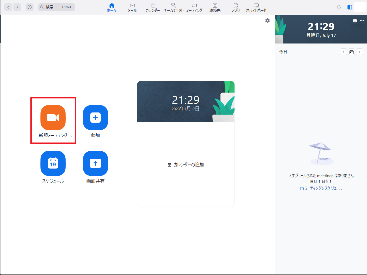 実際にWeb会議を開始するには、Zoomダウンロードセンターからダウンロードした、「ミーティング用zoomクライアント」を起動し、「新規ミーティング」をクリックします。