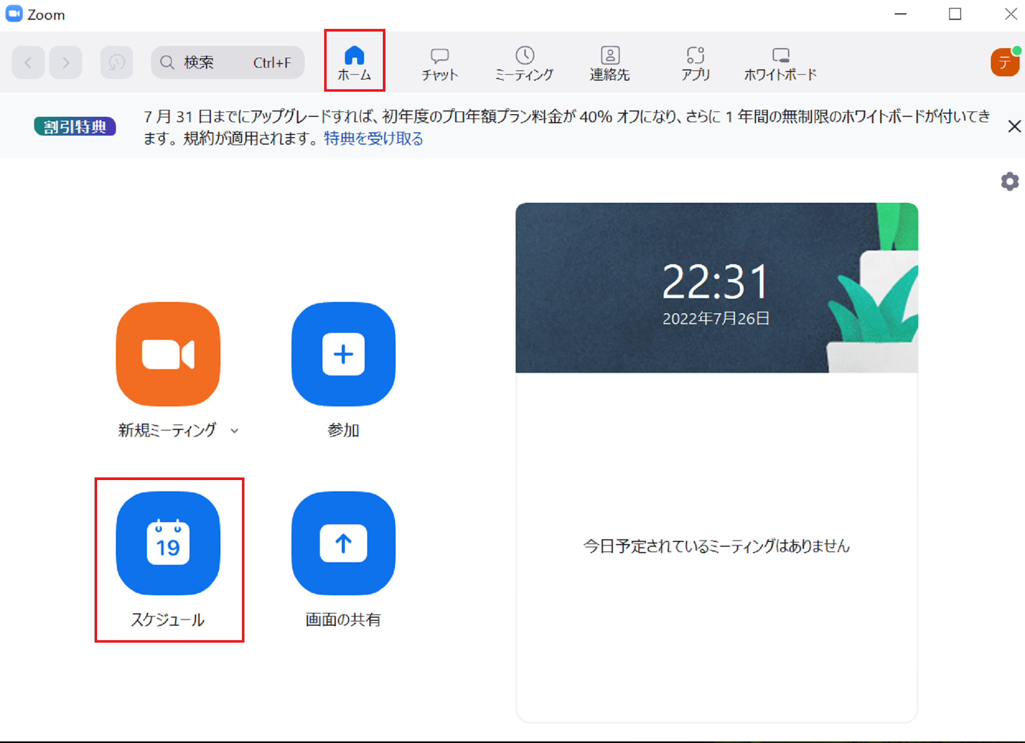 Zoomアプリを開いてホーム画面からスケジュールをクリックしてください。