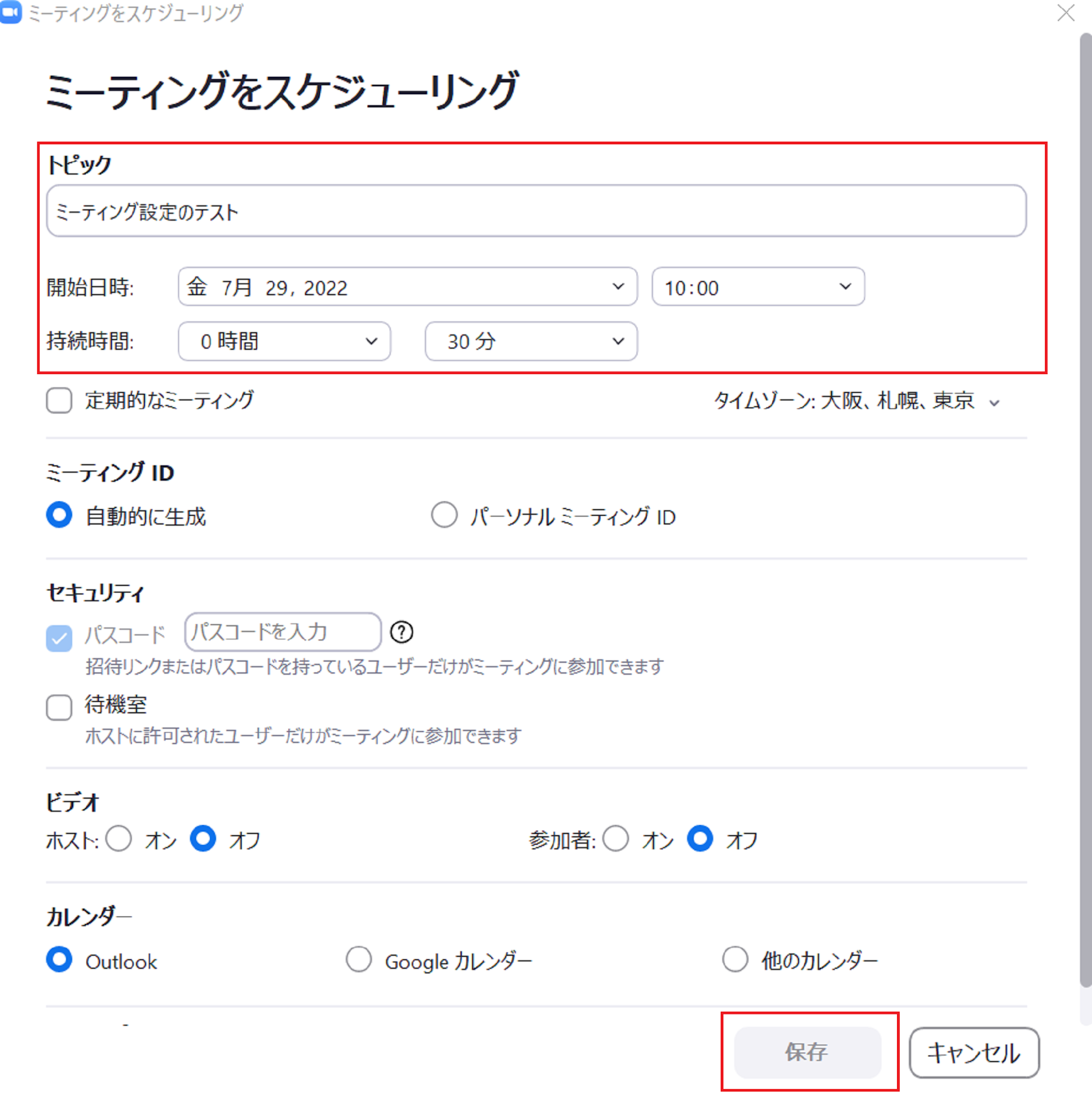 Zoomのミーティングを設定する画面が開きますので、こちらで「トピック」(議題)、「開始日時」、「持続時間」(予定時間)を入力して「保存」をクリックすれば、ホストとしてミーティングの設定は完了です。