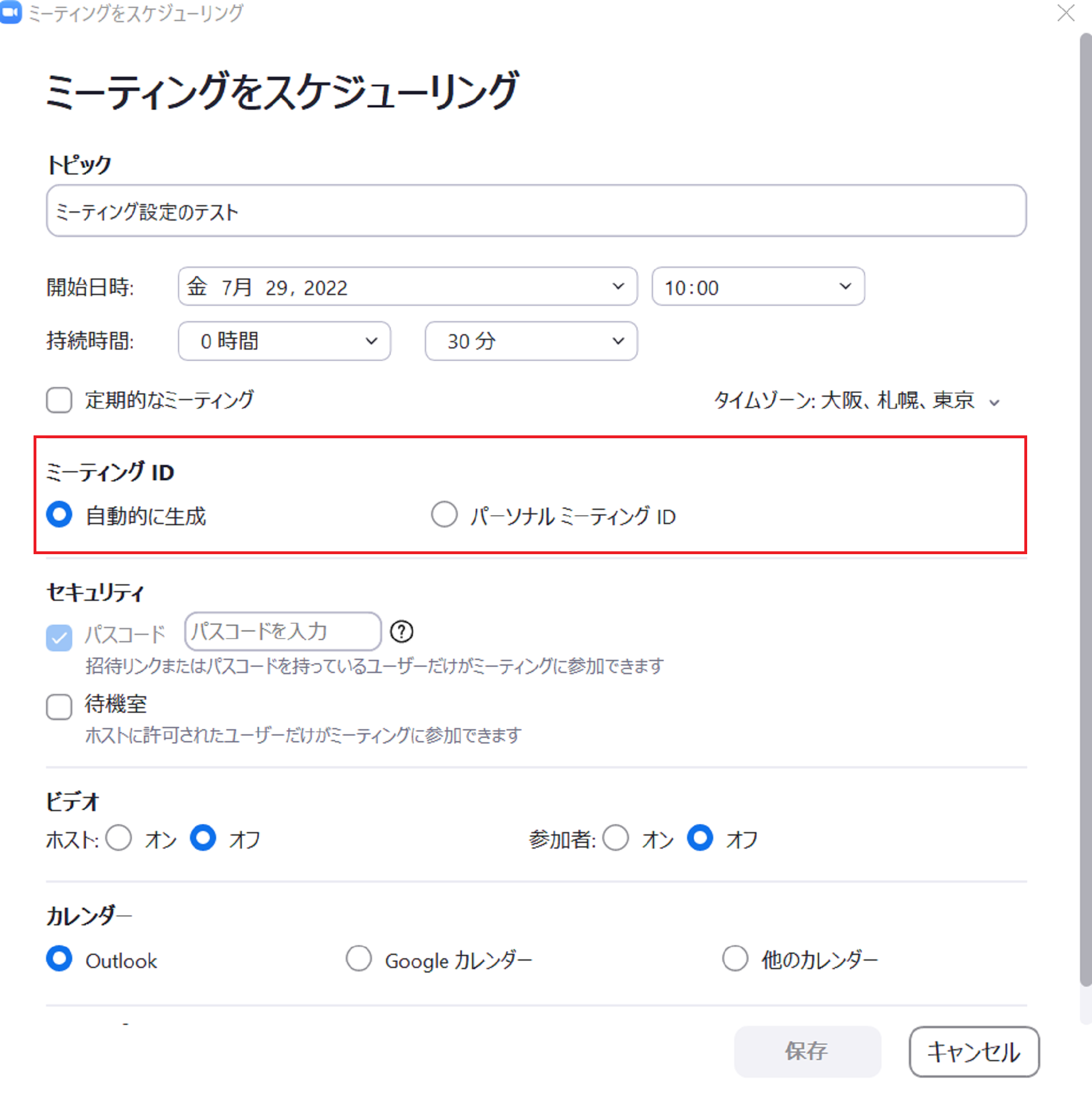 ミーティングIDの項目では、ミーティング毎にIDを作成するか、パーソナルミーティングIDを使用するか選択することができます。