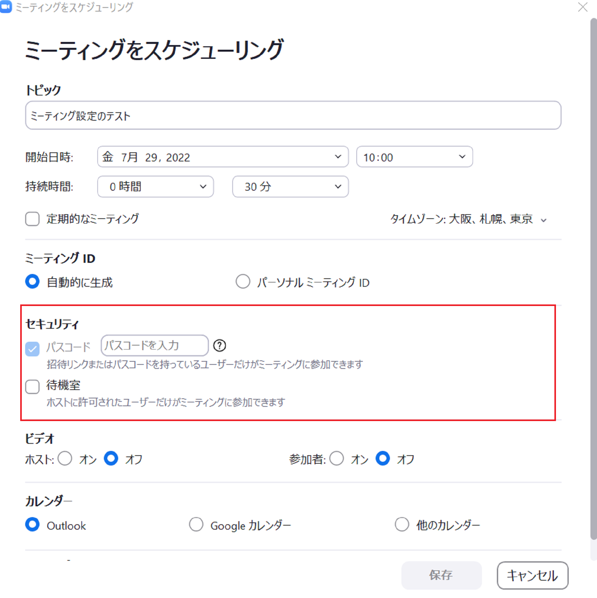 セキュリティの項目では、パスワードと待機室の設定ができます。設定したいパスワードを入力し、チェックを入れれば、パスワードを設定することができます。