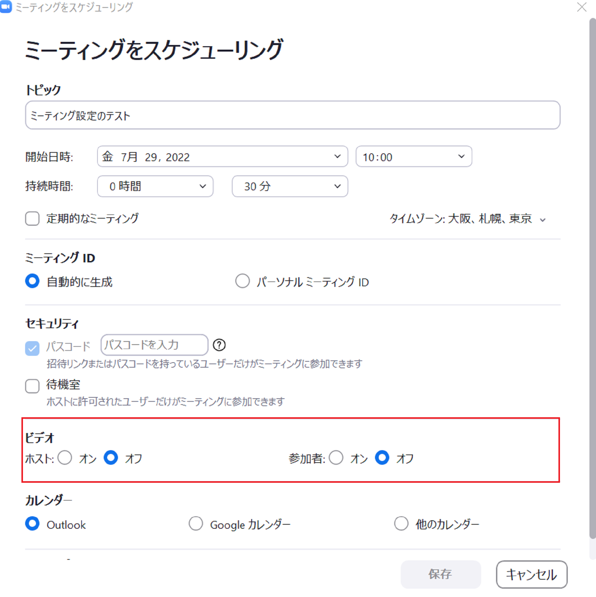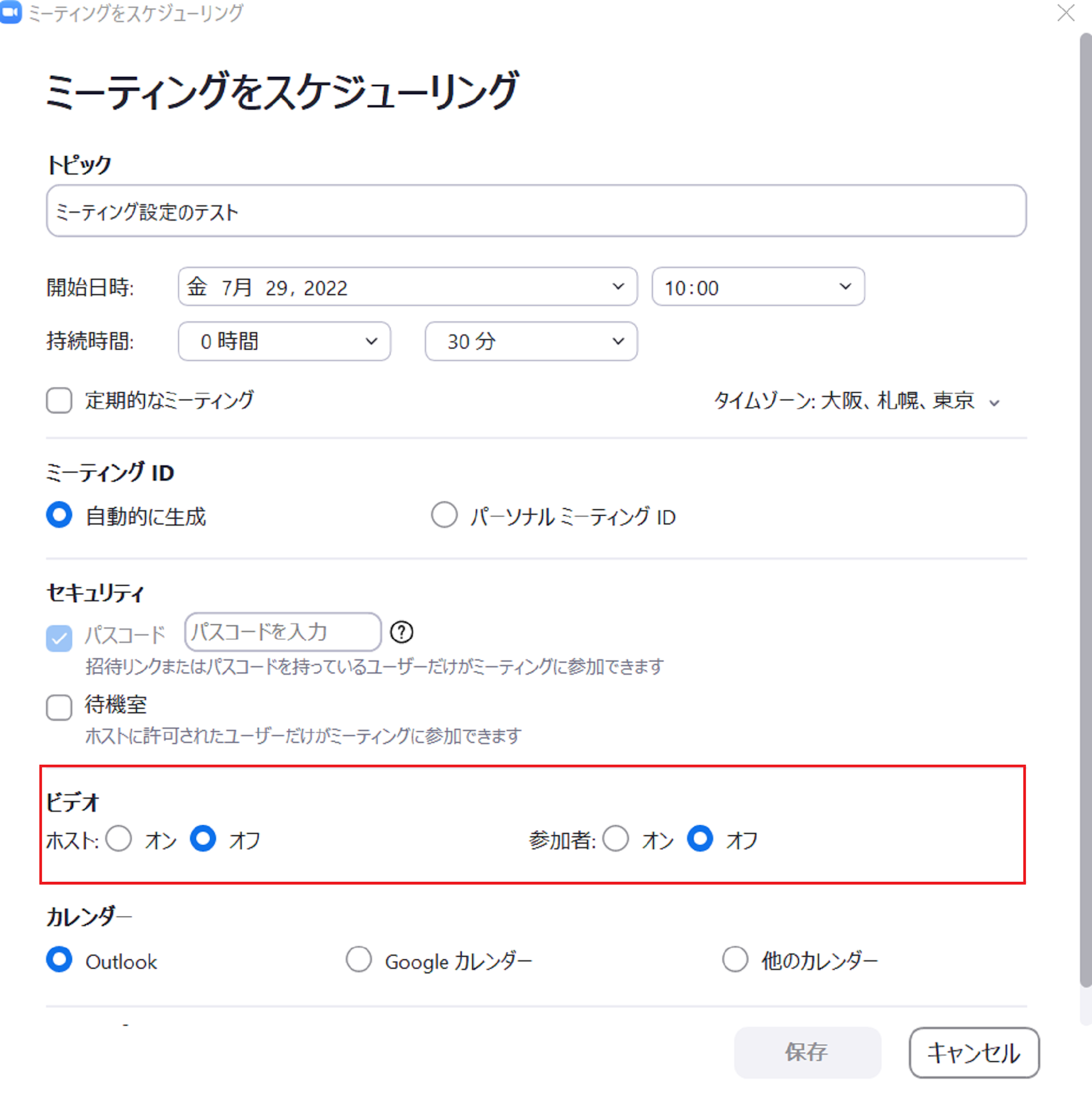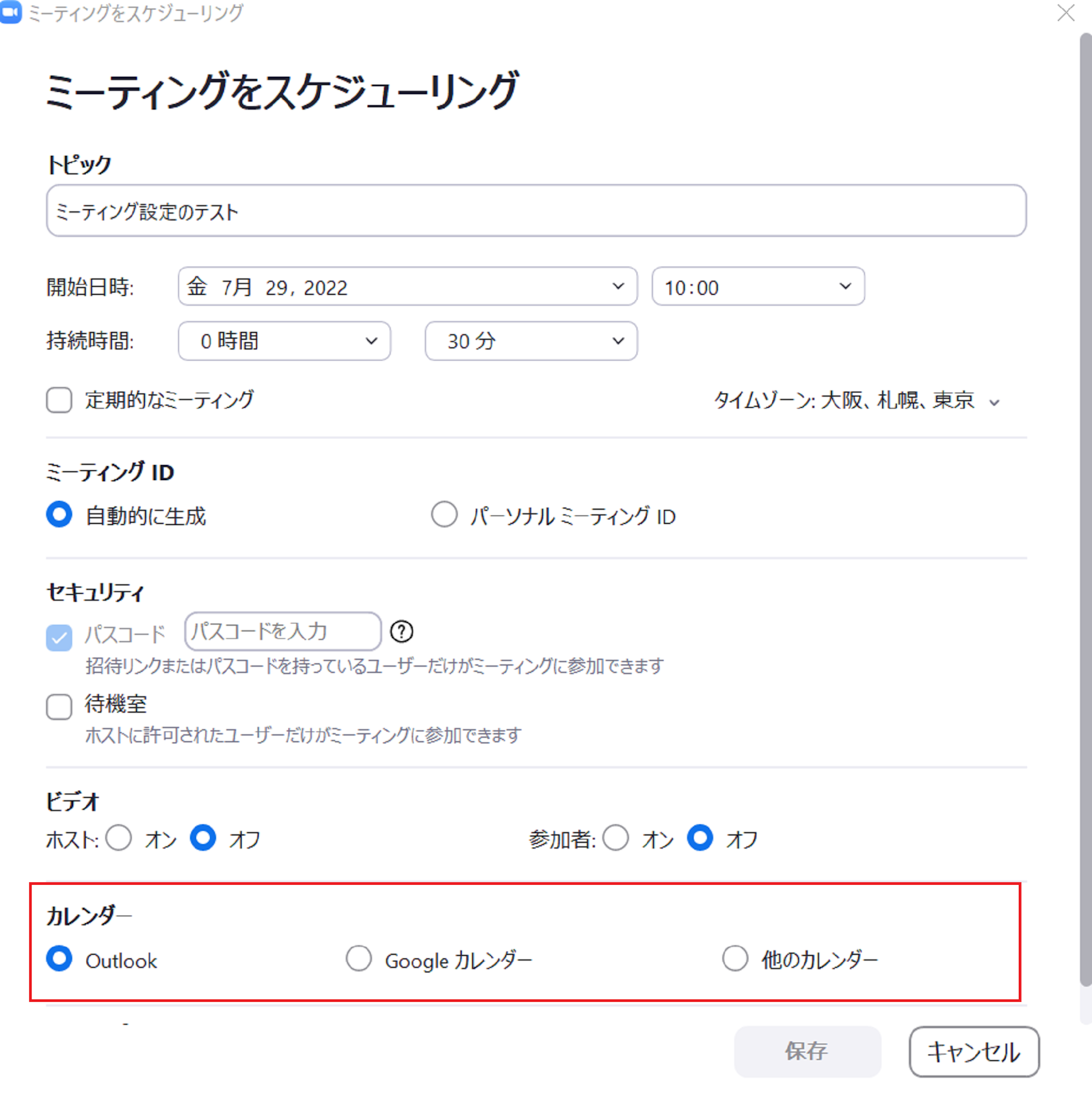 パスワードは設定しなければ、ミーティングを保存することはできませんのでご注意ください。