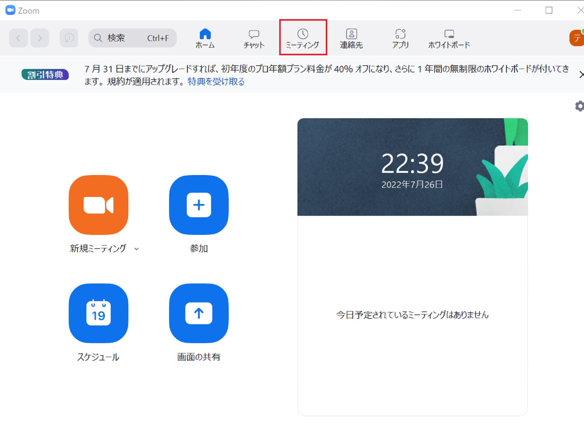Zoomアプリを開いてミーティングの項目をクリックしてください。
