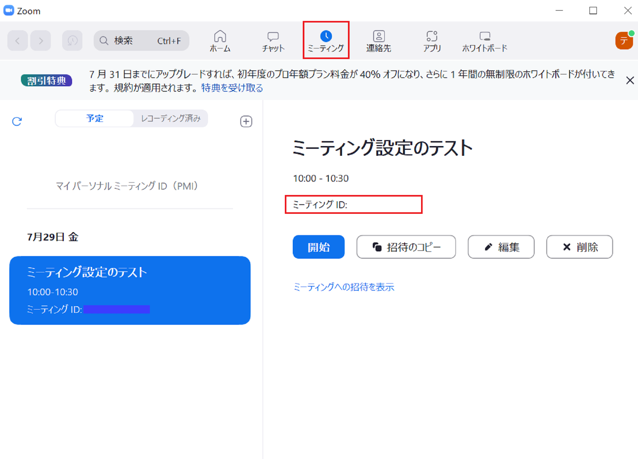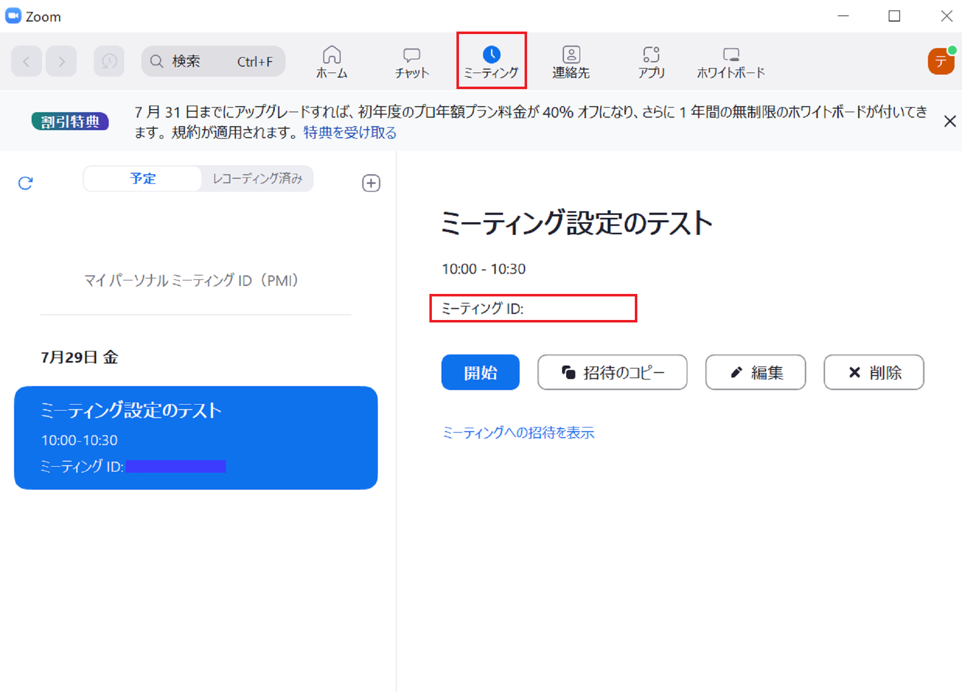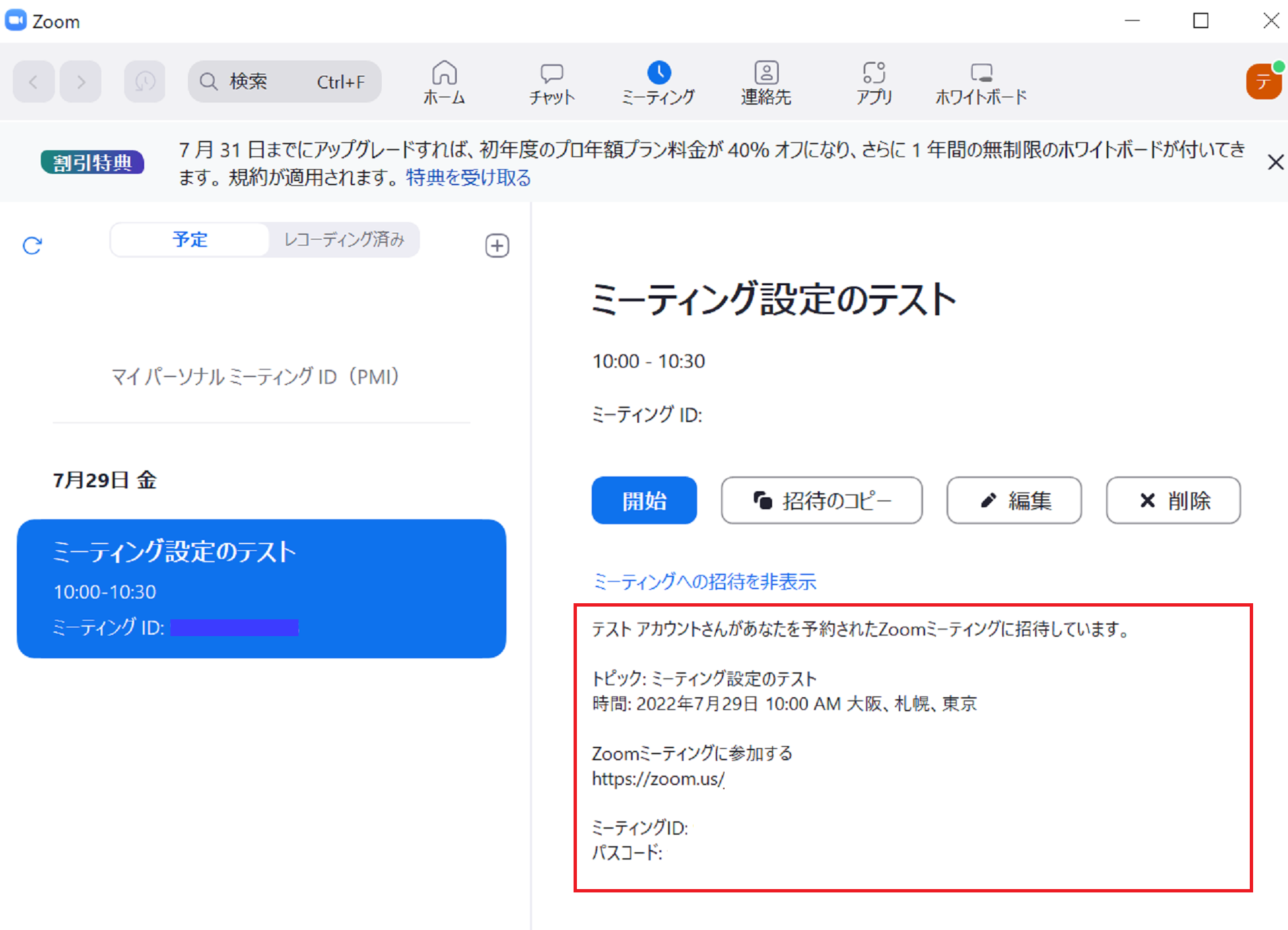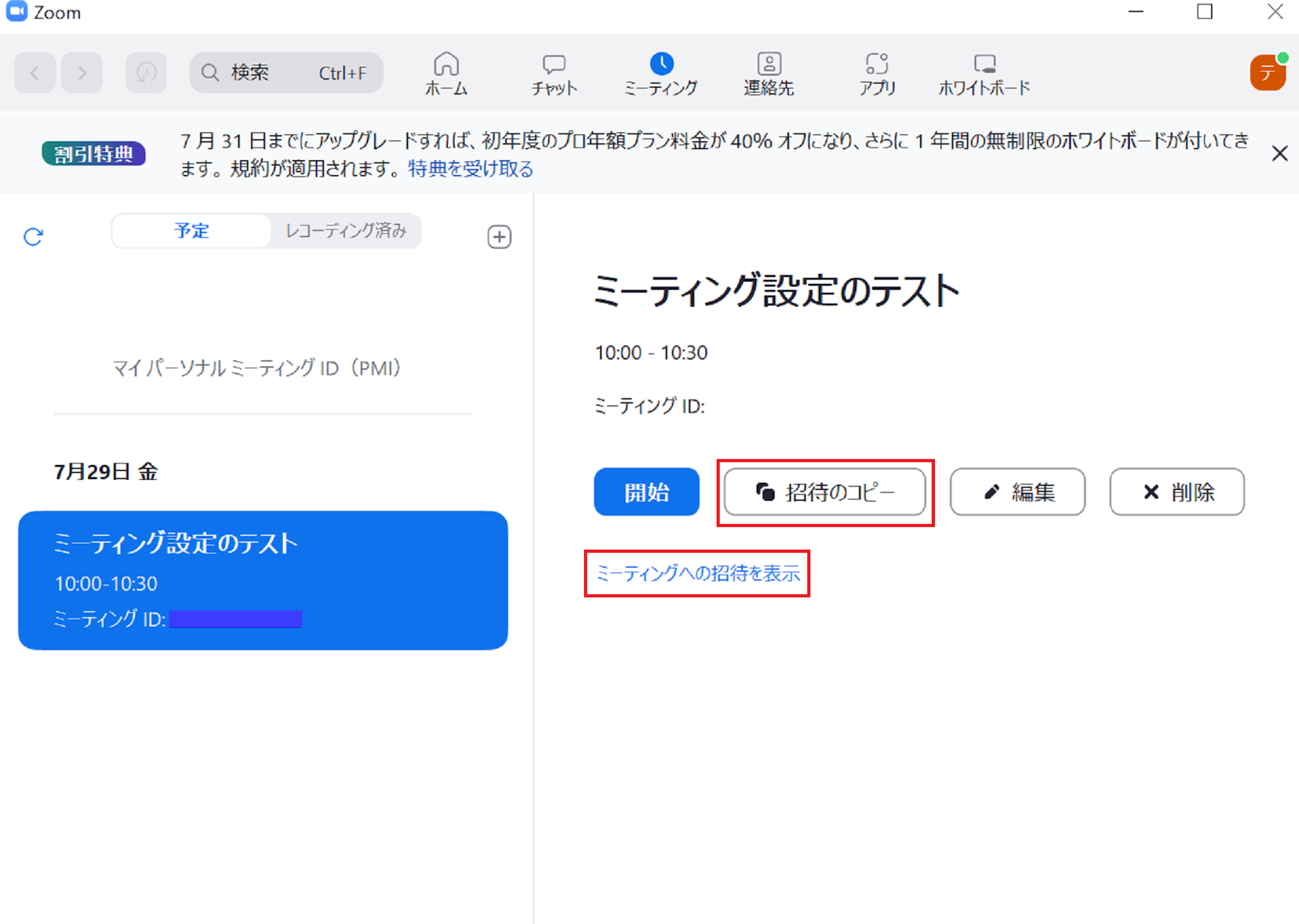スケジュールで登録したミーティングが出てきますので、案内を出したいミーティングの「招待のコピー」をクリックすれば、URL・ミーティングID・パスワード等が入った招待の案内文をコピーできます。