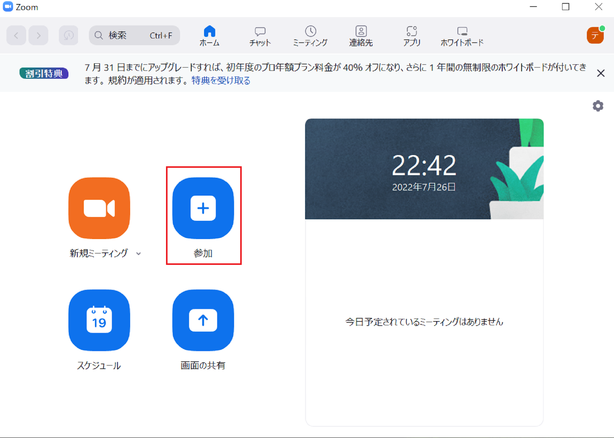 参加者(ゲスト)がミーティングIDを使用して入室する場合、Zoomアプリを開いてホーム画面の参加をクリックし、こちらでミーティングIDを入力するという流れになります。