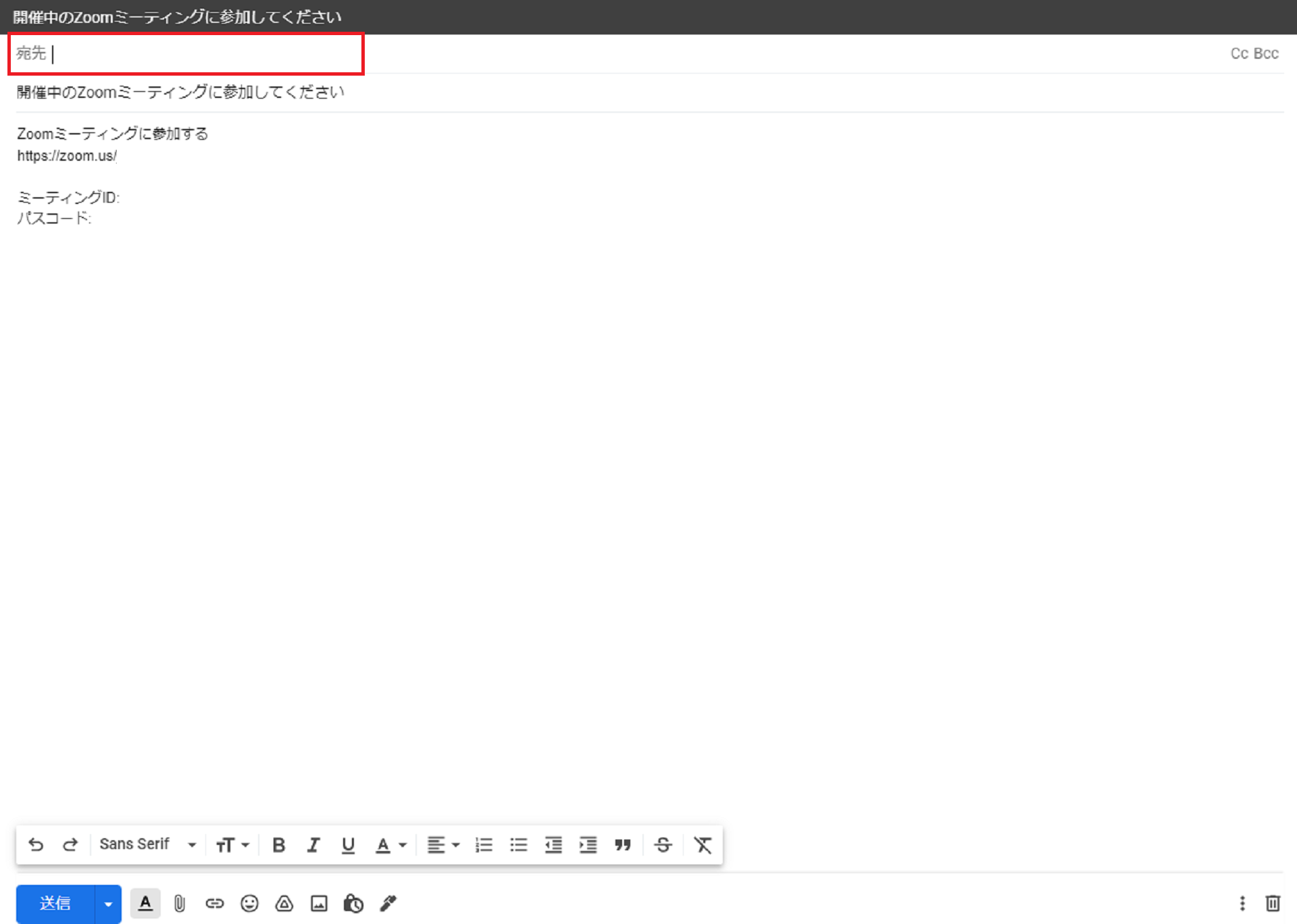 招待の案内(URL・ミーティングID・パスワード)が入った送信メールの下書きが作成されますので、招待したい参加者(ゲスト)を宛先とし、メールを送信すれば、ミーティング中の招待完了です。
