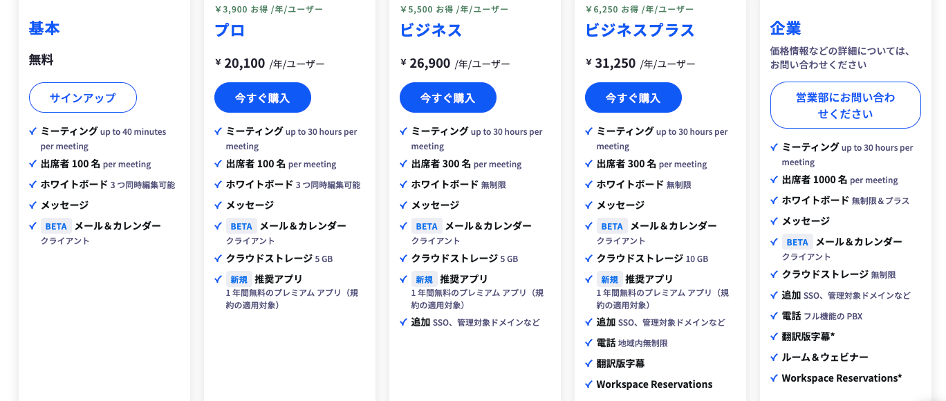 Zoom有料プランには、「プロ」「ビジネス」「ビジネスプラス」「エンタープライズ」の3種類があります。