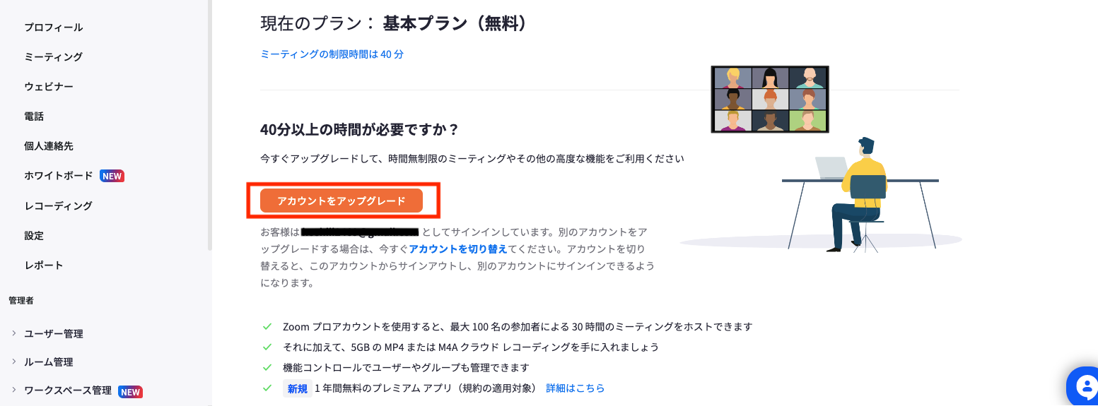 外部とのやり取りで時間制限で強制退出、、なんてことは先方に失礼です。有料プランに変更すれば会議時間の心配をする必要がなくなります。