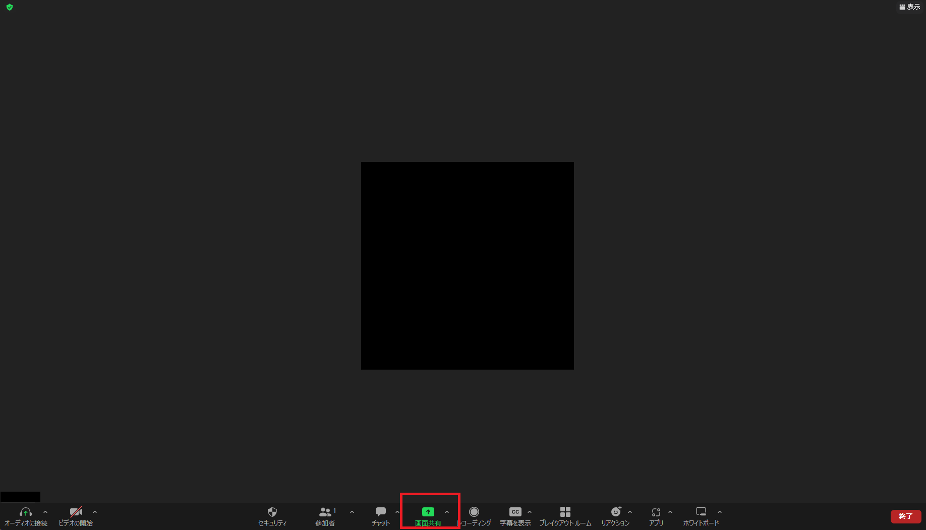 Zoomのビデオ通話を開始したら、画面下にある「画面共有」のボタンをクリックします。
