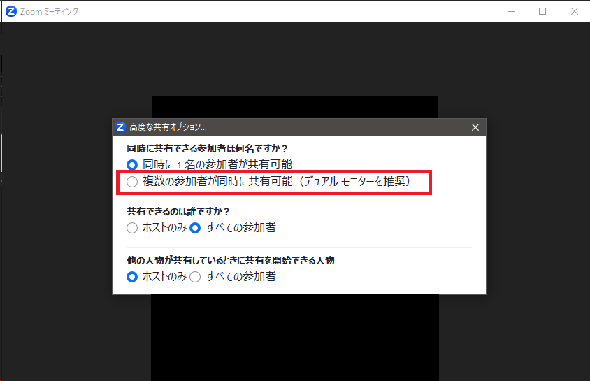 この操作は、まずホストが「画面共有」の横にある「^」ボタンから「高度な共有オプション」を開き、「複数の参加者が同時に共有可能」を選択しておく必要があります。