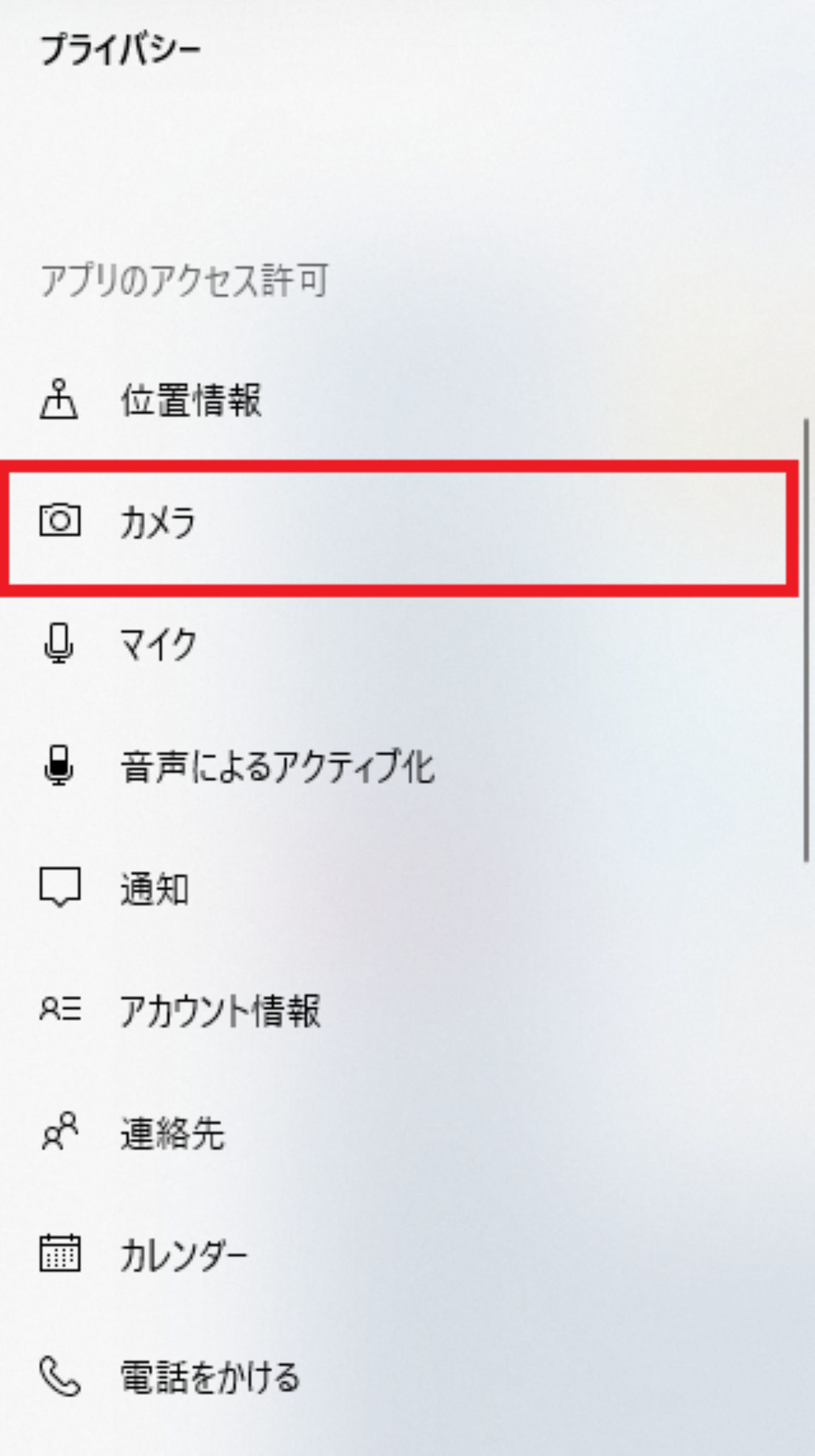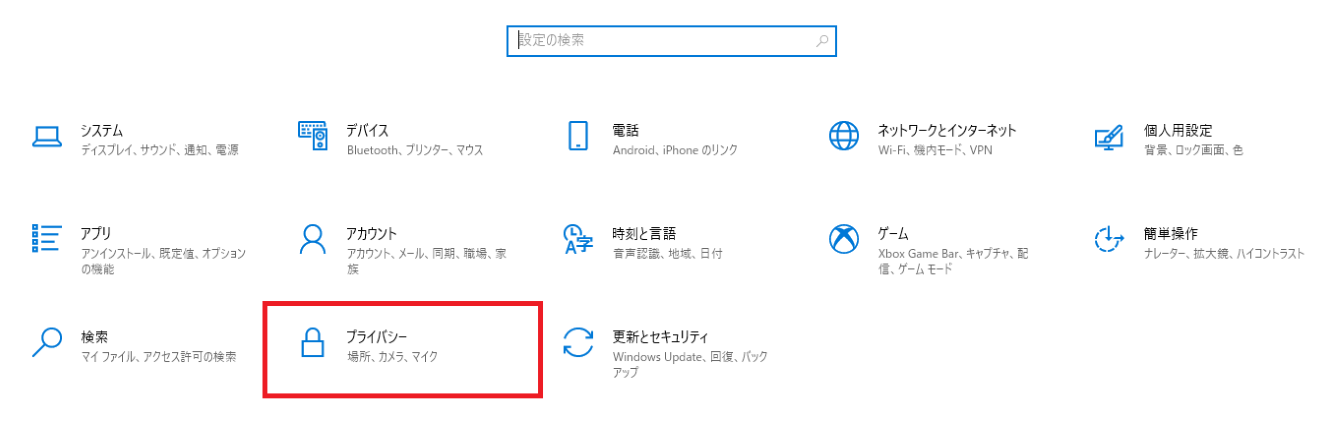 設定からプライバシーを開き、アプリのアクセス許可の中からカメラの設定をしましょう。